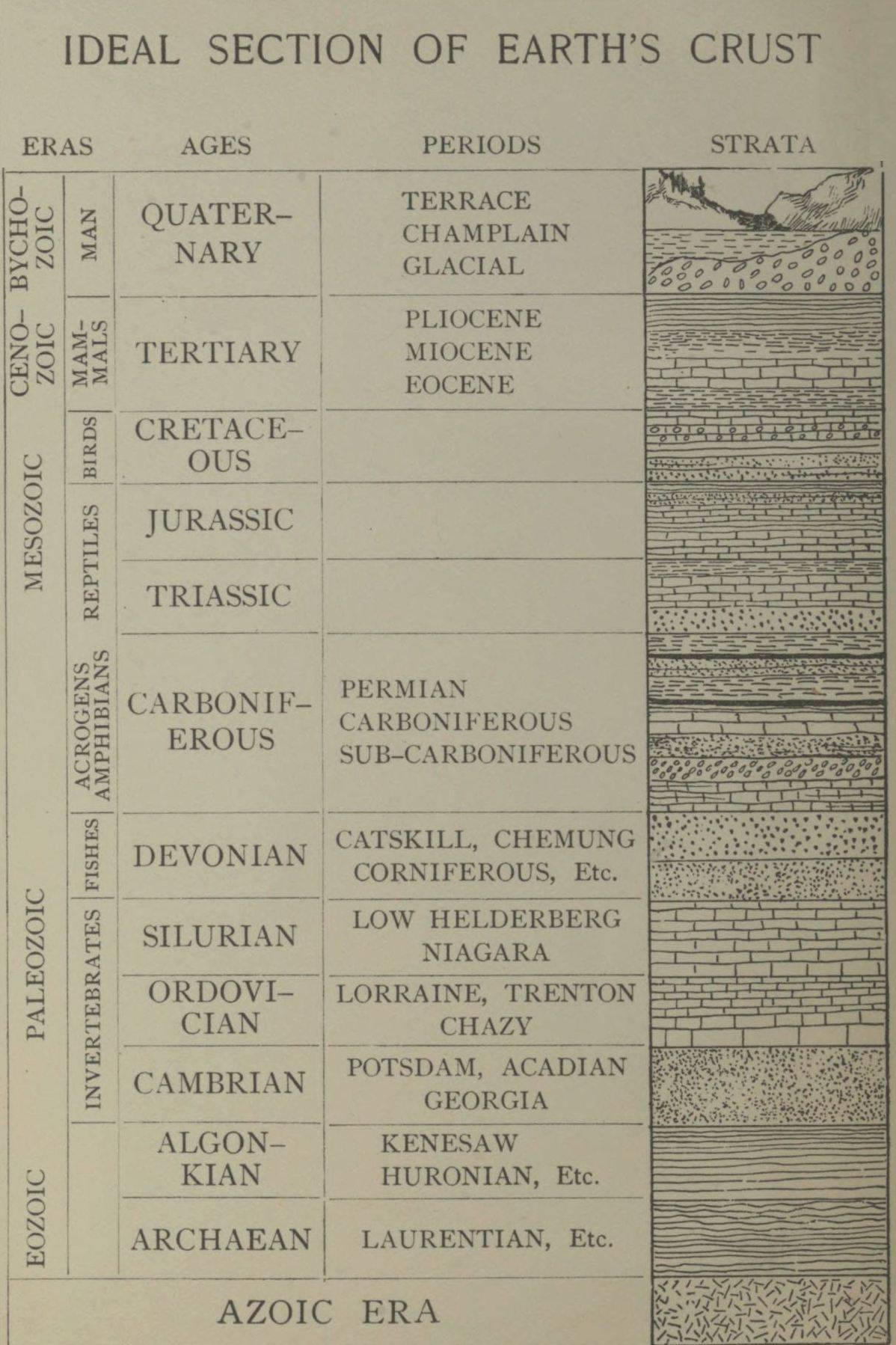 For a long time the Laurentian age was supposed to have been wholly destitute of any life, and was called the azoic, or life-lacking time. But Sir William Dawson, after long explorations among the Laurentian rocks, found in them the fossil remains of a once living creature. He named this creature the Dawn Animal, or Eozoön. The name suggests that this is the most ancient animal yet discovered, and represents the dawn of life on our planet.