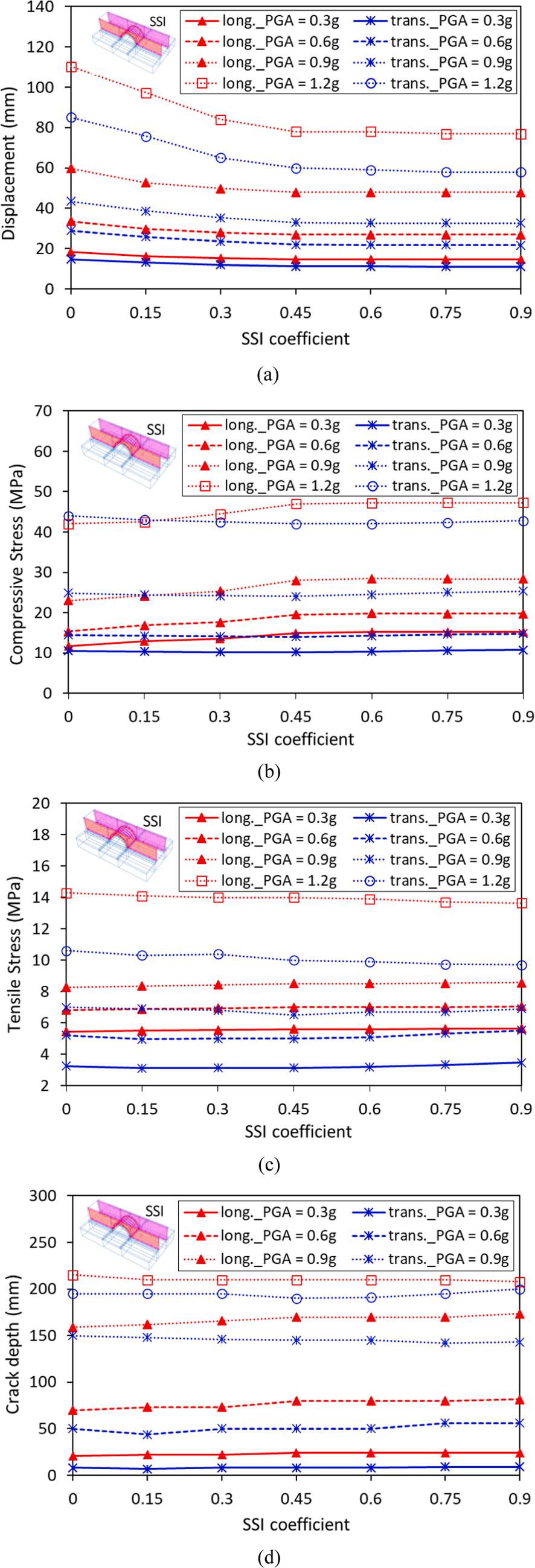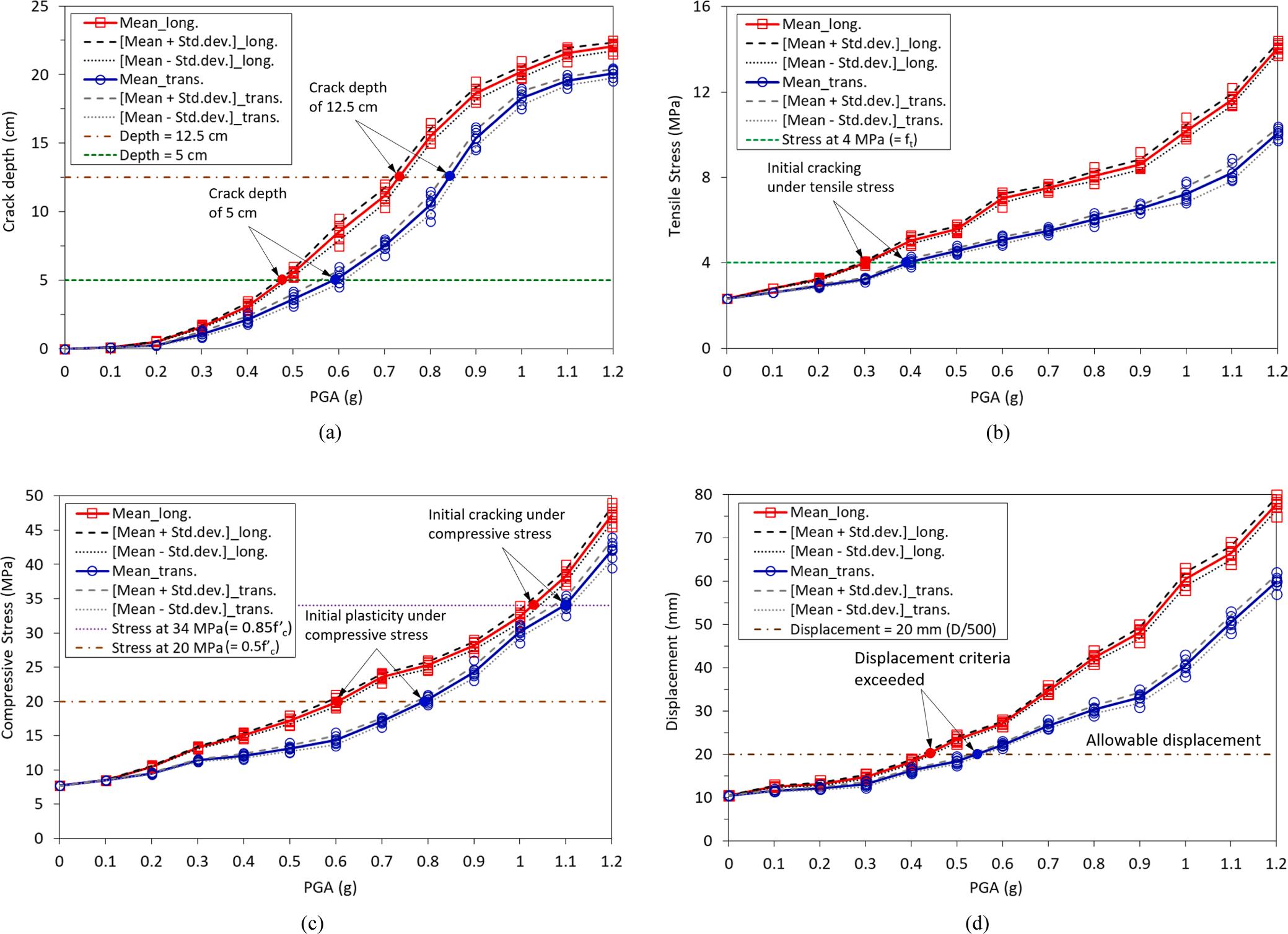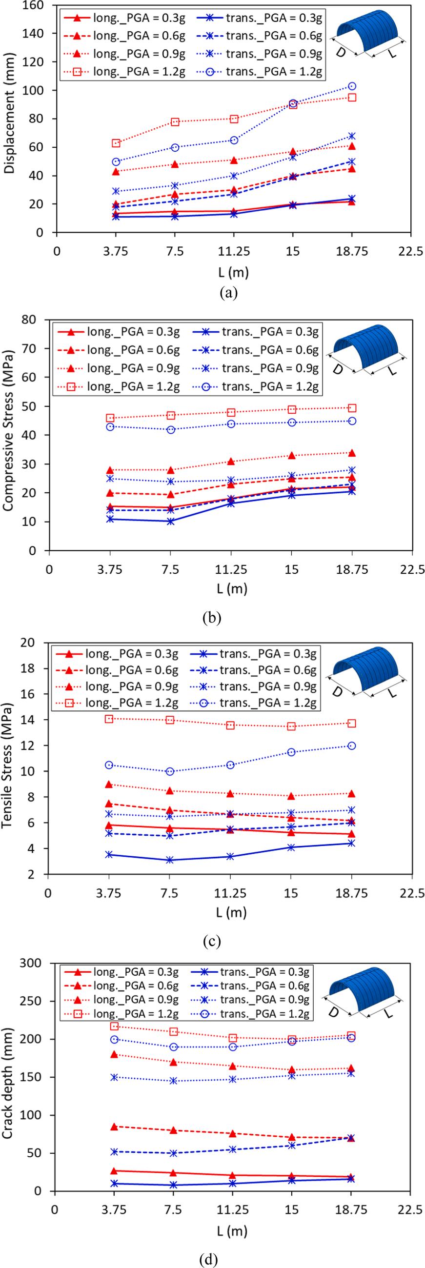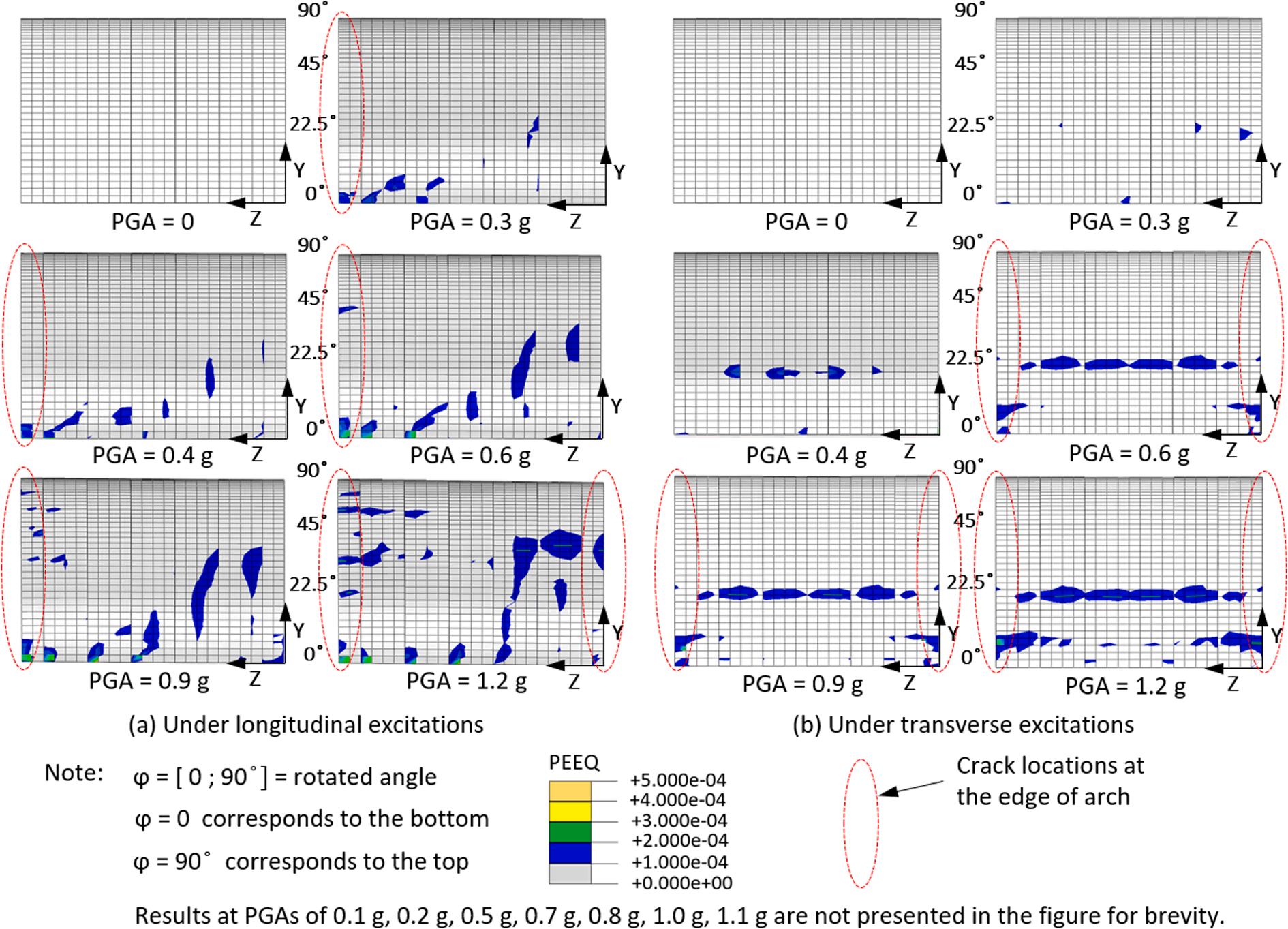 Fig. 8(a) depicts the arch crack depths and extensions for different PGAs. The crack depth reached 5 cm under a longitudinal PGA of 0.47 g or under a transverse PGA of 0.59 g. Crack depths of 12.5 cm were realized for longitudinal and transverse PGAs of 0.73 g and 0.84 g, respectively. When the PGA (either longitudinal or transverse) does not