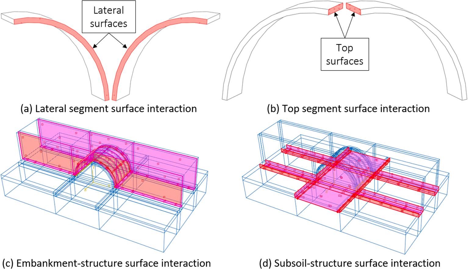 In the FEA model, contact surfaces were used to model the shearforce resistance between segments. These surfaces were classified into two groups: arch-to-arch interactions (AAIs), representing contacts between segmental components [as shown in Fig. 3(a) and Fig. 3(b)], and soil–structure interactions (SSIs), representing contact between the concrete and surrounding soil [as shown in Fig. 3(c) and Fig. 3(d)]. These contact surfaces were modeled with surface-to-surface contact