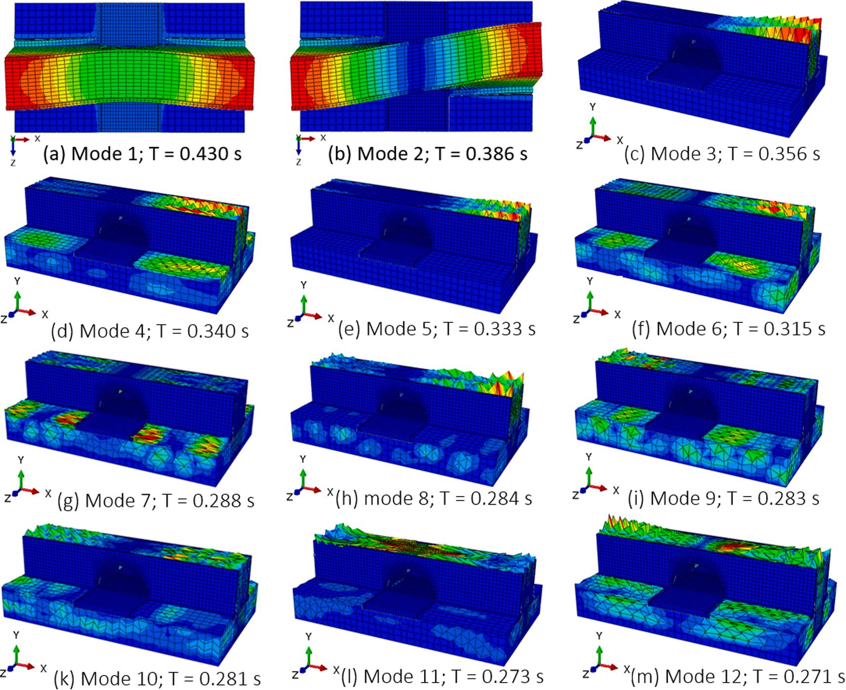 The natural periods of the MUAB were calculated, to investigate the vibrational characteristics of the MUAB according to the Lanczos eigenvalue-extraction procedure (Lanczos, 1950; Ojalvo and Newman, 1970; Paige, 1971) available in ABAQUS (Abaqus, 2014). The periods of the first twelve modes (along with their corresponding effective masses) are listed in Table 5; these mode shapes are shown in Fig. 6. The sum of the effective masses in each component direction for the first 12 modes exceeded 90% of the MUAB total mass. The effective mass distribution characterizes the relative contributions of the modes when the MUAB is excited along a specific direction with a given frequency. These modes can contribute to the interface loads. The interface-load-based effective mass was measured to identify two target modes determining the MUAB’s dynamic behavior. The natural periods of the first and second modes were 0.430 s and 0.386 s, respectively. The figure and table show that the first two modes of the MUAB were dominated by flexural and torsional effects. On the other hand, the first two mode shapes suggest that the other modes were directly associated with the effects of surrounding soil deformation.