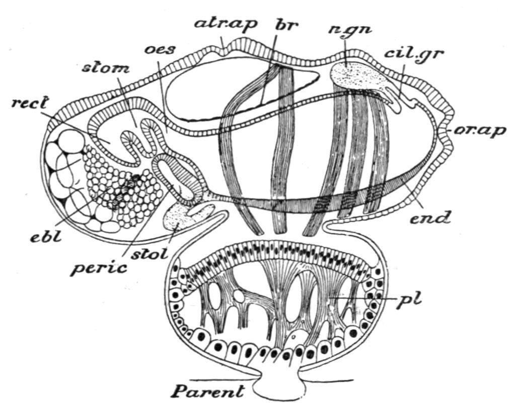(2) Some of the median buds become foster forms ("phorozooids"), which, like the preceding trophozooids, do not become sexually mature, but, unlike them, are eventually set free as cask-shaped bodies having the Doliolumappearance, with eight encircling muscle-bands, and having, moreover, a ventral outgrowth (not a stolon), which is formed of the stalk by which the body was formerly attached to the dorsal process of the oozooid. On this ventral outgrowth the "gonozooids" (3) are attached while still very young buds, and after the phorozooids are set free these reproductive forms gradually attain their complete development, become sexually mature, and are eventually separated off, finally losing all trace of their temporary connexion with the foster-forms. They resemble the foster-forms in having a cask-shaped body with eight muscle-bands, but differ in the absence of a ventral process, and in having the sexual reproductive organs fully developed.