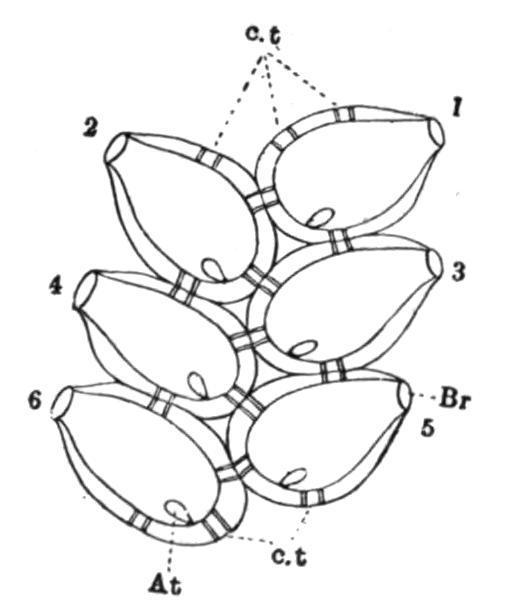 FIG. 62. Diagram to show the arrangement and connexion of the aggregated zooids in a young chain of Salps. 1, 3, 5, zooids on the right; 2, 4, 6, zooids on the left. At, Atrial aperture of a zooid; Br, branchial aperture of another; c.t at the top of the figure points to three pairs of connecting tubes; c.t at the foot, to two pairs. Each zooid is united to each of the four neighbours it touches by a pair of connecting tubes, and so has eight such tubes in all.