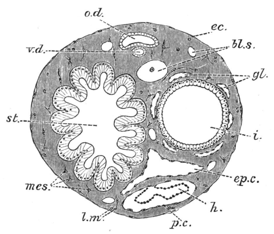 The large spaces at the sides of the dorsal lamina (often called the gill or branchia of Salpa), by means of which the cavity of the branchial sac is placed in free communication with the peribranchial cavity, are to be regarded as gigantic gill-slits formed by the suppression of the lateral walls and small stigmata of the branchial sac. The alimentary canal at the posterior end of the "gill" consists of oesophagus, stomach, and intestine, with a pair of lateral gastric glands or caeca. These viscera along with the reproductive organs, when present, make up the "nucleus" (Fig. 66, v).