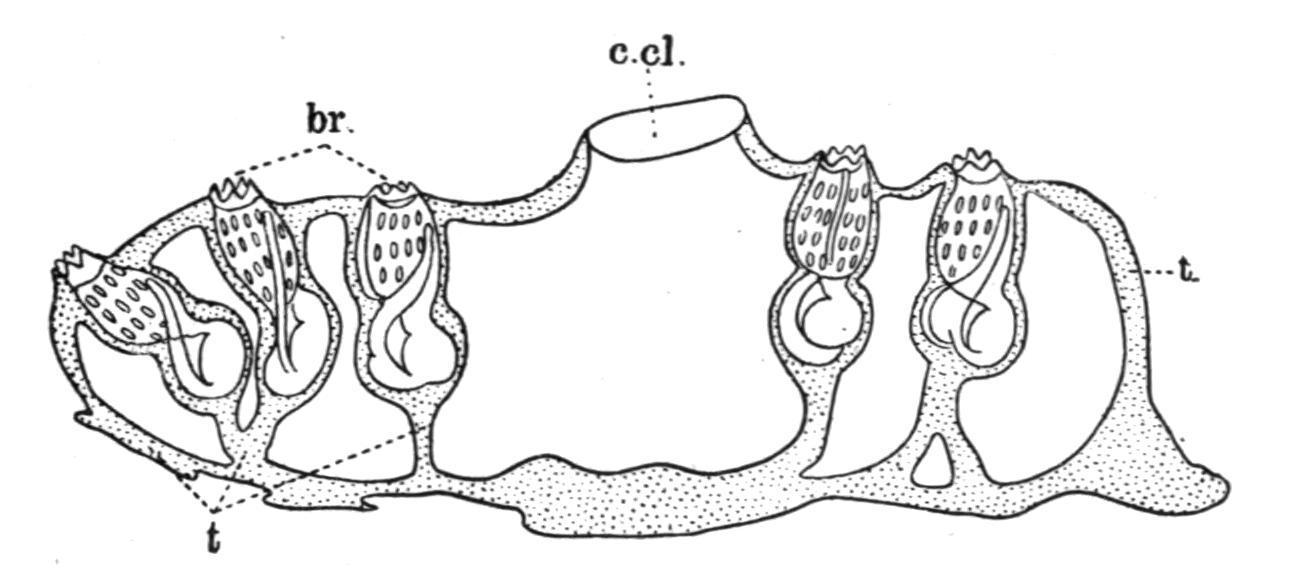 Anatomy. The more important points in the structure of the ascidiozooid of Pyrosoma are shown in Fig. 57. A circle of tentacles, of which one, placed ventrally (tn), is larger than the rest, is found just inside the circular branchial aperture. From this point a wide cavity, with a few circularly placed muscle-bands running round its walls, leads back to the large branchial sac (br.s.), which occupies the greater part of the body. The large stigmata are elongated transversely (dorso-ventrally), and are crossed by internal longitudinal bars running antero-posteriorly. The dorsal lamina is represented by a series of eight or ten languets. The