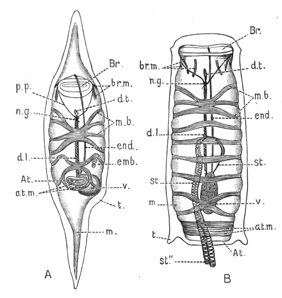 FIG. 61. Salpa runcinata-fusiformis. A, aggregated or "chain" form; B, solitary form. At, Atrial aperture; at.m, atrial muscles; Br, branchial aperture; br.m, branchial muscles; d.l, dorsal lamina or "gill"; d.t, dorsal tubercle; emb, embryo; end, endostyle; m, mantle; m.b, muscle-bands; n.g, nerve-ganglion; p.p, peripharyngeal bands; st, stolon; st″, "chain" of buds; t, test; v, visceral "nucleus."