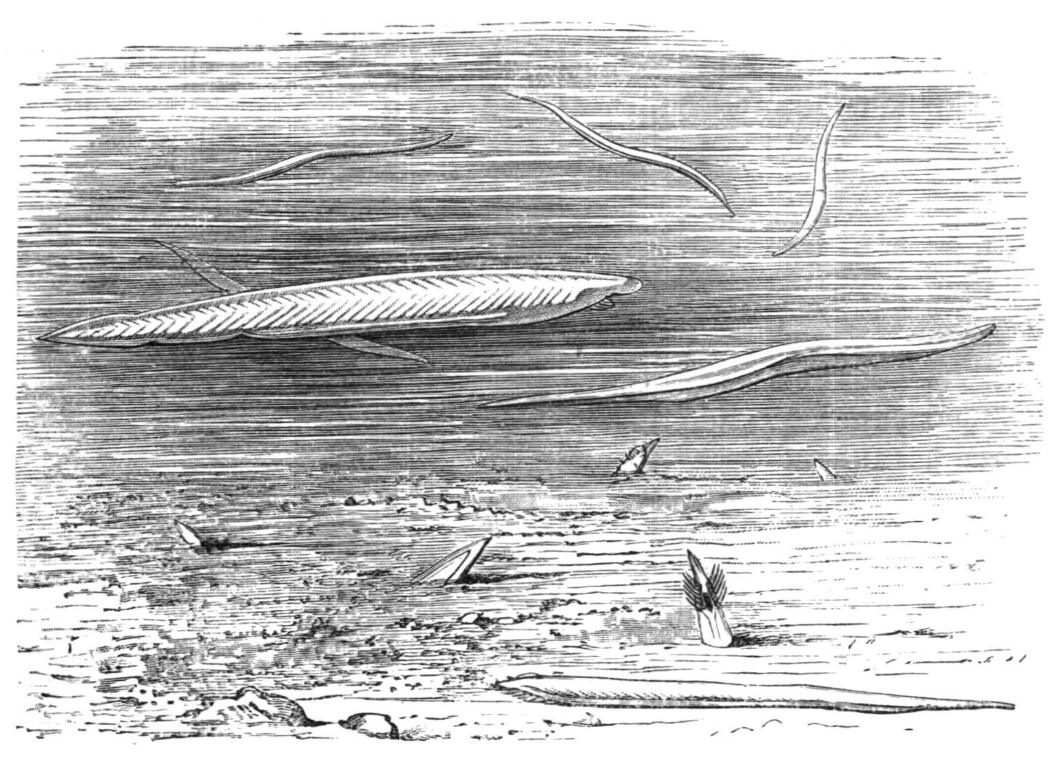 FIG. 69. Amphioxus (Branchiostomalanceolatum) in the Pantano at Messina. (After Willey.)