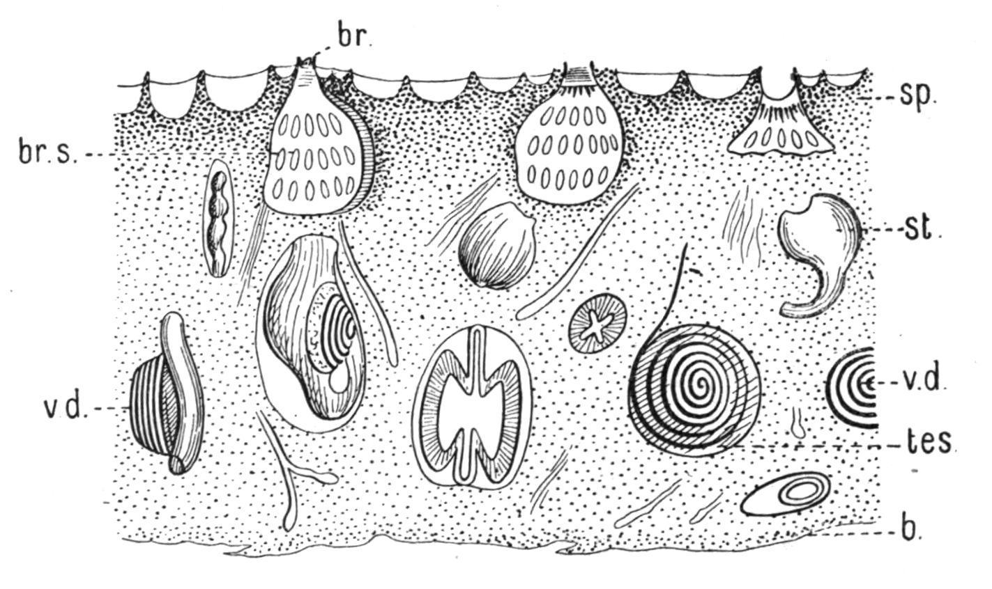colony; Goodsiria, Cunningham, with the ascidiozooids completely imbedded in the investing mass (Fig. 54); and Chorizocormus, Herdman, with the ascidiozooids united in little groups which are connected by stolons. The last genus contains one species, Ch. reticulatus, in some respects a transition-form between the other Polystyelidae and the Styelinae amongst Simple Ascidians.