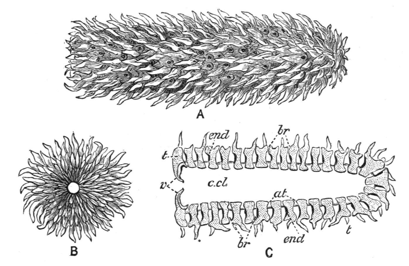 FIG. 56.—Pyrosoma. A, lateral view (nat. size); B, end view; C, diagram of longitudinal section. at, Atrial apertures; br, branchial apertures; c.cl, common cloaca; end, endostyle; t, test; v, velum or diaphragm at terminal opening.