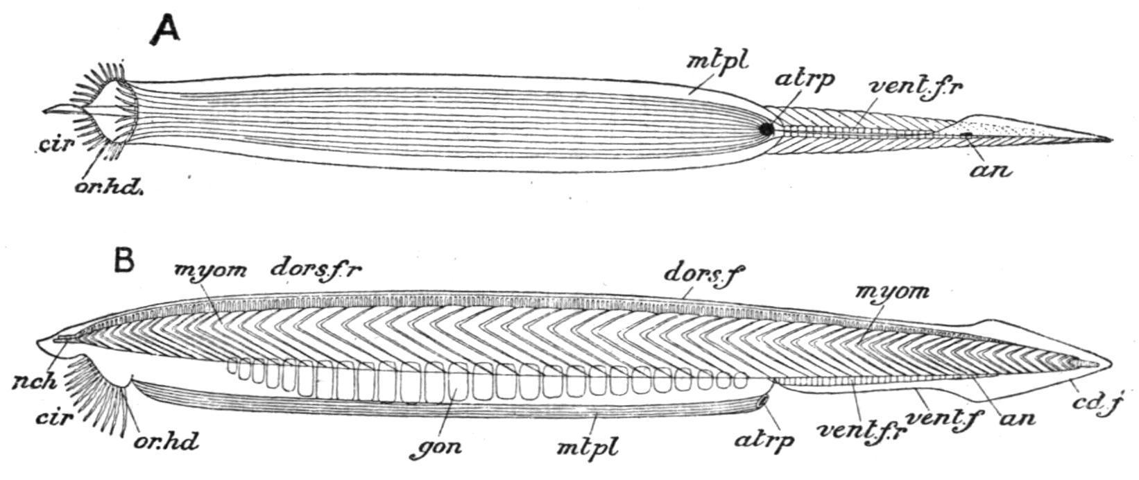 FIG. 70. Branchiostoma lanceolatum. A, ventral; B, side view of the entire animal. an, Anus; atrp, atriopore; cd.f, caudal fin; cir, cirri; dors.f, dorsal fin; dors.f.r, dorsal fin-rays; gon, gonads; mtpl, metapleure; myom, myomeres; nch, notochord; or.hd, oral hood; vent.f, ventral fin; vent.f.r, ventral fin-rays. (After Kirkaldy.)