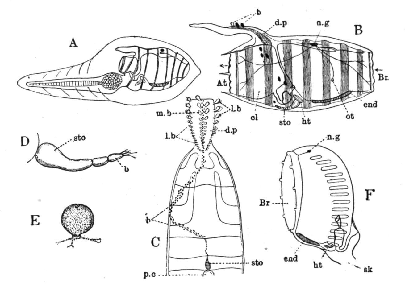 FIG. 60. Life-history of Doliolum. A, tailed larval stage; B, "nurse" or oozooid, showing buds (blastozooids) migrating from the ventral stolon to the dorsal process; C, posterior part of much later oozooid to show buds arranged in three rows on dorsal process; D, stolon segmenting; E, young migrating bud; F, trophozooid developed from one of the buds of a lateral row. At, Atrial aperture; b, buds; Br, branchial aperture; cl, cloaca; d.p, dorsal process; end, endostyle; ht, heart; l.b, lateral buds; m.b, median buds; n.g, nerve-ganglion; ot, otocyst; p.c, pericardium; sk, stalk; sto, stolon. (After Uljanin and Barrois.)