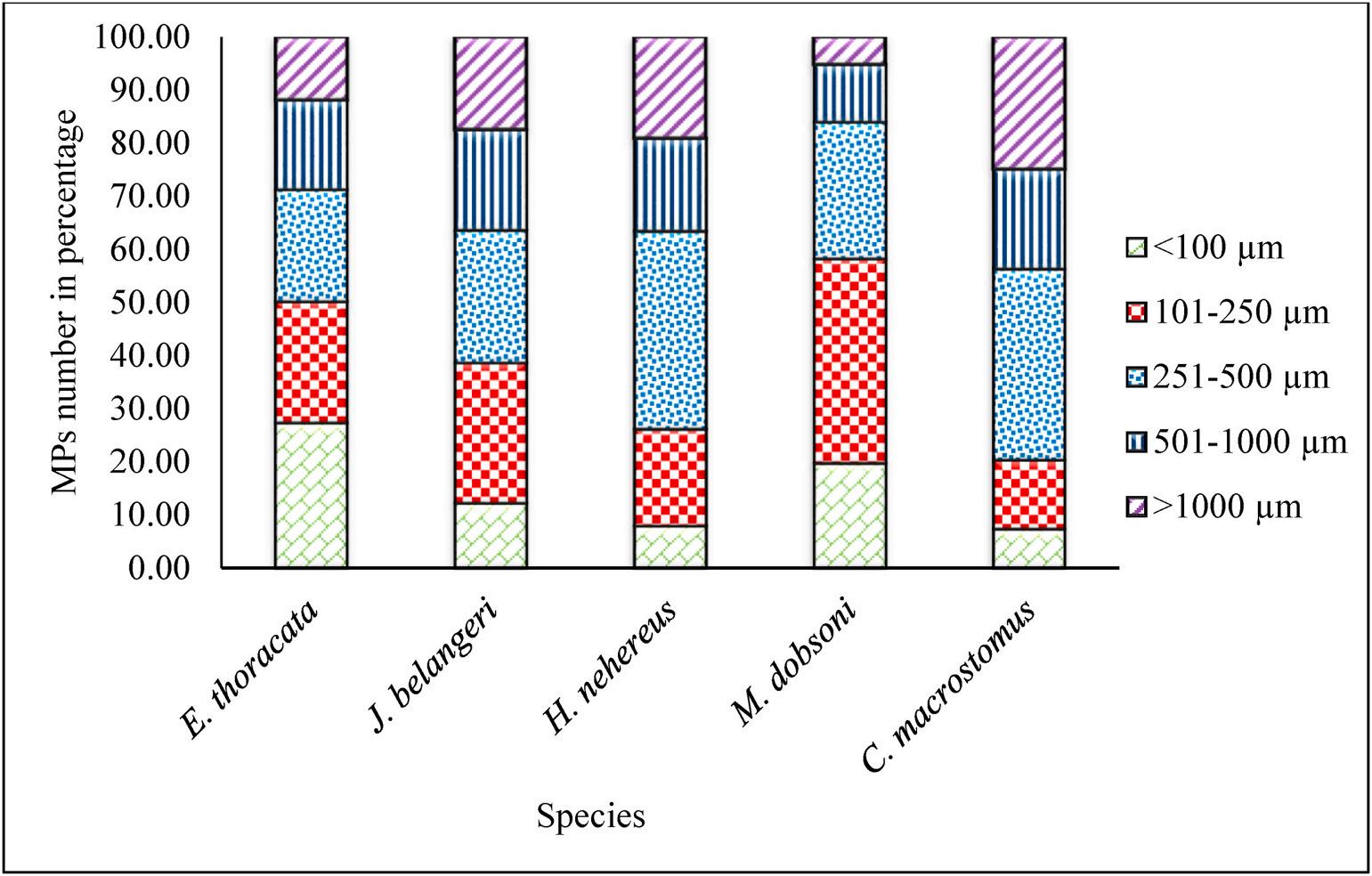 which might be due to differences in their preferred habitat and feeding types. A higher number of small size MPs (<100 μm) recorded in white sardine and shrimp might be due to their smaller body size, limited choice of food items, and microplastic particle size similar to their prey size (Hossain et al., 2019; Cole et al., 2013). The number of MPs with the size of 251–500, 501–1000 and > 1000 μm were significantly (P < 0.05) higher in Bombay duck, which may be due to their larger size of mouth, body, and feeding behavior, which agreed with earlier findings of Hossain et al. (2019) The number of MPs with the size of 501–1000 μm did not show a significant (P > 0.05) difference between white sardine, croaker, and sole fish.