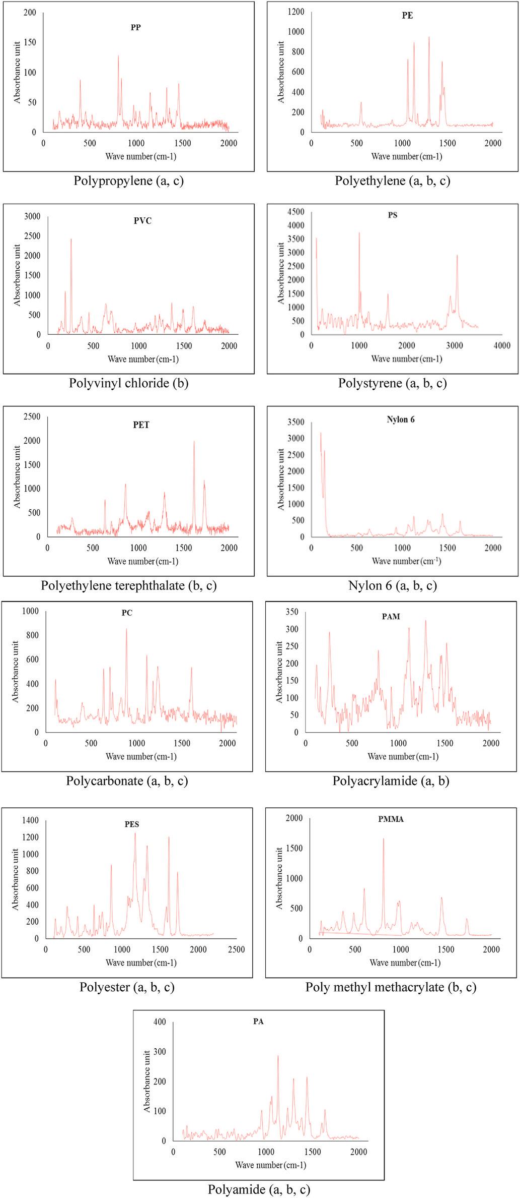 Fig. 9. Raman spectroscopy results of microplastics obtained from the studied (a) water, (b) sediment and (c) biota samples. Polypropylene (a, c) Polyethylene (a, b, c) Polyvinyl chloride (b) Polystyrene (a, b, c) Polyethylene terephthalate (b, c) Nylon 6 (a, b, c) Polycarbonate (a, b, c) Polyacrylamide (a, b) Polyester (a, b, c) Poly methyl methacrylate (b, c) Polyamide (a, b, c).