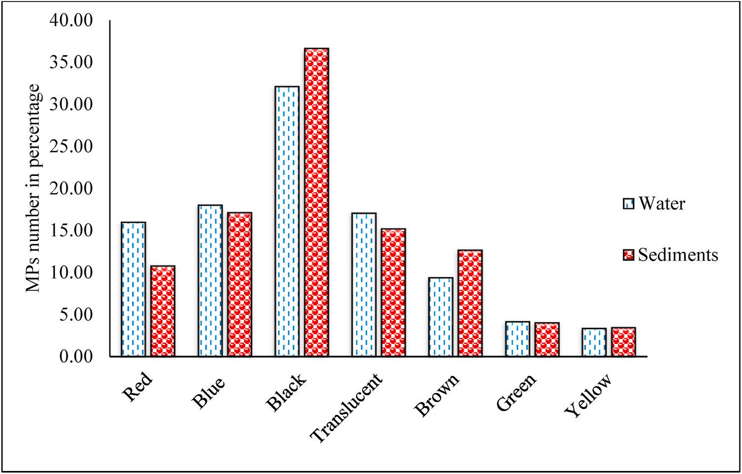 5. Color wise composition of MPs recorded in the water and sediments. (For interpretation of the references to color in this figure legend, the reader is referred to the Web version of this article.)