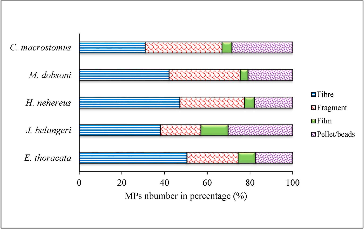 Concerning the characteristics, four different morphotypes of the MPs were observed in the studied samples. The most common shape of MPs was categorized as fiber, followed by fragments, pellet/beads, and film (Fig. 3). In Cynoglossus macrostomus, fragments were dominantly recorded while fiber types were dominant in all other species compared to other MPs shapes (Fig. 7). The results of the present study align with the result of earlier reports from the Mediterranean sea (Nadal et al., 2016) and Bohai Sea (Dai et al., 2018), where different species of shrimps and fishes dominantly ingested fibers (Gurjar et al., 2021b; Hossain et al., 2020; Jabeen et al., 2017; Sathish et al., 2020). Globally, fiber-shaped MPs are present in the highest abundance in the marine