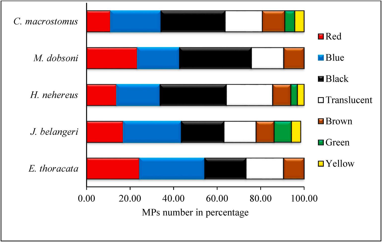Daniel et al. (2020) recorded six different colors (red, blue, green, transparent, white, black) of MPs from inedible tissue (gills and viscera) of pelagic fishes. Similar to findings of the present study, different colors of MPs were recorded in different pelagic and demersal fishes from other parts of the globe (Boerger et al., 2010; Daniel et al., 2020; Lusher et al., 2013; Ory et al., 2017). Hossain et al. (2020) recorded five colors of MPs