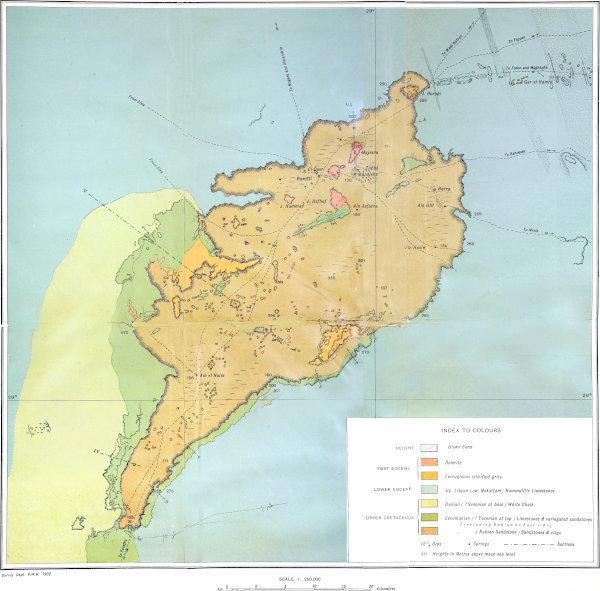 would find easy work in the cracked-up rocks, and still easier would be its task in partly removing the soft Cenomanian sandstones and clays after the harder limestones had disappeared. The primary excavation of the hollow was followed by the formation of a great lake, in which were laid down deposits of sandstone, quartzite, and iron-ore; this lake doubtless surrounded islands, represented to-day by those hills which still preserve their limestone-caps; it extended, or similar lakes existed, beyond the oasis-limits, forming the quartzites and ferruginous sandstones passed on the way from Maghagha to Baharia, and was perhaps continuous with the Oligocene and post-Oligocene sea which covered a large part of the country to the north.