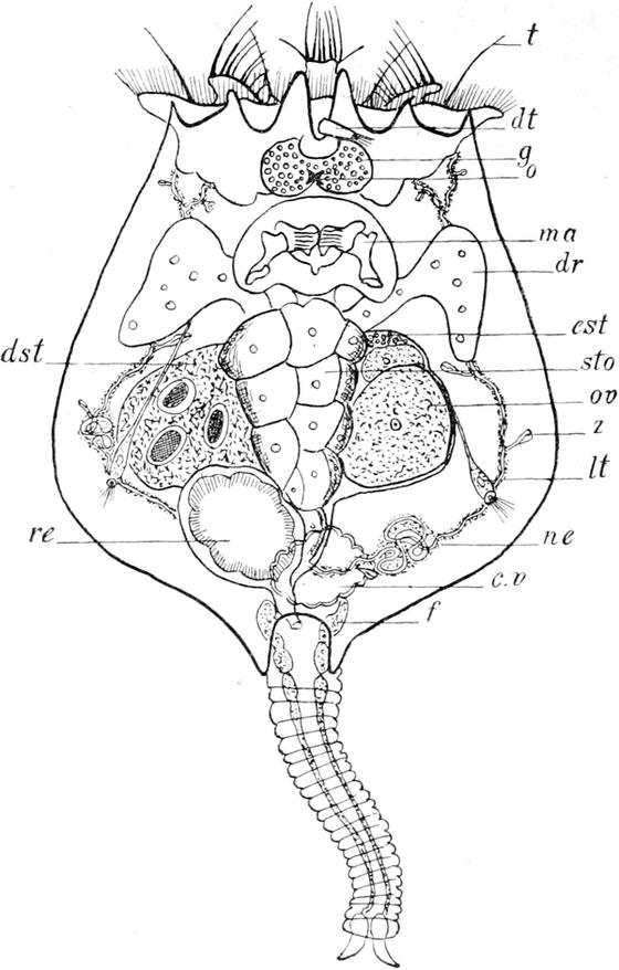 einzelnen Fällen eine Abweichung von der typischen Lagerung der inneren Organe. Ist er z. B. sehr flach gebaut (Pterodina, Metopidia), so kommen die Geschlechtsorgane im entwickelten Zustande teilweise neben den Darm, anstatt unter ihn, zu liegen. Ferner hat sich die Öffnung der Kloake von der Dorsalseite auf die Bauchfläche verschoben bei den Gattungen Pterodina, Anuraea und Dinocharis, welch’ letztere auch dadurch bemerkenswert ist, dass bei ihr der Hals panzerartig erhärtet ist, während sonst der Kopf stets weichhäutig bleibt.