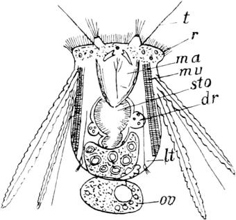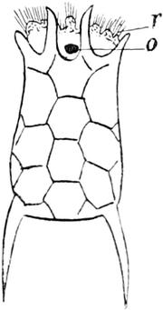 — Ein besonderes Interesse beanspruchen die bei den Gattungen Polyarthra, Triarthra, Pedetesund Pedalionvorkommenden Anhänge, da sie auffallend an die Extremitäten der Entomostraken erinnern. Wie diese sind sie scharf, zumteil sogar gelenkig, vom Körper abgesetzt, sind beweglich, tragen nicht selten gefiederte Borsten und dienen der gleichen Funktion, nämlich zum Rudern. Dennoch sind dieselben nur als analoge Bildungen anzusehen, denn die zwei wichtigsten Merkmale der Entomostraken-Gliedmassen, die paarweise und ausschliesslich ventrale Gruppierung und der Spaltfusscharakter, gehen ihnen völlig ab.