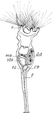 Ventralseite genähert, die Mundöffnung. Die Breite des Kopfes ist bald dieselbe wie in den mittleren Körperregionen, bald wird sie etwas geringer als diese, so dass sich der Körper nach vorn leicht verjüngt. Bei besonders mächtiger Entwickelung des Räderapparates (s. weiter unten) kann der Stirnfläche auch die Maximalbreite des Körpers zukommen. Hinter der Afteröffnung verjüngt sich der Körper fast aller Rädertiere und bildet so den zur dauernden oder vorübergehenden Anheftung dienenden Schwanz (Fig. 62, 63, 64, 65, 69). Dieser Schwanz kann in sehr verschieden deutlichem Grade sich vom Mittelkörper absetzen. Bei den in Fig. 62–65 abgebildeten Arten gehen beide ganz allmählich in einander über. Bei der Asplanchnopus myrmeleo (Fig. 68) sitzt der kurze in zwei Zehen auslaufende Schwanz nicht am Hinterende des Rumpfes, sondern fügt sich der Bauchseite ein gutes Stück weiter nach vorn an. Fig. 69 zeigt uns einen Brachionus, bei dem der schmale Schwanz fast die halbe Körperlänge erreicht, von dem viel breitern Mittelkörper sehr scharf abgesetzt ist und durch besondere Muskeln vorübergehend ganz in diesen zurückgezogen werden kann. Endlich giebt es eine Anzahl Formen, denen ein echter Schwanzanhang überhaupt fehlt; so die Gattungen Polyarthra (Fig. 66), Triarthra, Hertwigia, Asplanchna, Anuraea (Fig. 67), Sacculus. Bei diesen mangeln mit dem Schwanze gleichzeitig die Fuss- oder Klebdrüsen, sodass die Tiere nicht im stande sind, sich festzuheften. — Die Fussdrüsen (f) sehr vieler Rädertiere münden an der Spitze zweier (selten einer: Monostyla) sehr verschieden langer dolchförmiger Zehen, die bald an einander gelegt, bald gespreizt getragen werden. Bei den im erwachsenen Zustande dauernd festsitzenden Melicertiden, z. B. der Gattung Floscularia (Fig. 65), sind zwar die Fussdrüsen mächtig entwickelt, Zehen hingegen fehlen, und der Körper endet mit einer quer abgestutzten kleinen Fläche. Anderseits giebt es eine Abteilung unter den Rädertieren, bei denen die Zehen stets in grösserer Zahl als zwei auftreten. Es sind dies die Philodiniden, wozu der gemeine Rotifervulgaris und fast alle Erdrotatorien gehören. Bei diesen läuft der Schwanz bald in drei (Rotifer, Actinurus), bald in vier (Philodina[XII]) Zehen aus, die cylindrische fingerförmige Anhänge darstellen. Vier kurze Zehen kommen auch der an den Beinen
