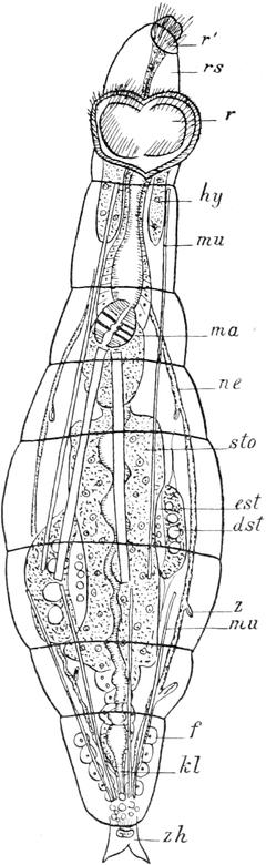 überhaupt zukommen. Sie dienen vermutlich als Leber, indem sie ein die Verdauung unterstützendes Sekret in den Magen entleeren. Der Enddarm unterscheidet sich im histologischen Bau nur unwesentlich von dem Magen, von dem eine ringförmige, muskulöse Einschnürung ihn trennt. Er geht nicht direkt in den querspaltigen, ungefähr am Anfange des letzten Körperviertels auf der Rückenseite gelegenen After (a) über, sondern beide trennt ein kurzer, flimmerloser Zwischenkanal, die sogen. Kloake. Sie nimmt ausser dem Enddarm die Ausführgänge der Zeugungs- und Exkretionsorgane auf.