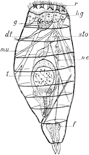 An der glashellen Körperwand der Hydatina lassen sich zwei verschiedene Lagen unterscheiden. Die äussere (c) ist völlig homogen und gegen dünne Kalilauge sehr widerstandsfähig, sodass wir ihr eine hornartige, „chitinige“ Beschaffenheit zuschreiben dürfen. Die innere (hg) hingegen ist feinkörnig, protoplasmatisch und enthält von Stelle zu Stelle einen Kern. Besondere Zellgrenzen lassen sich in dieser Protoplasmaschicht nicht erkennen, sie stellt vielmehr ein „Zellsyncytium“, d. h. eine durch Verschmelzung der ursprünglich getrennten Zellen einheitlich und kontinuierlich gewordene Lage dar. Man bezeichnet sie als „Hypodermis“ und nimmt an, die äussere Schicht, die „Kutikula“, sei durch Abscheidung von ihr erzeugt. Nur in zwei Körperregionen schwillt die Hypodermis zu ungewöhnlicher Dicke an. Dieselben liegen an den beiden Polen des Körpers, nämlich einmal längs des ganzen Randes des Kopftrichters, woselbst die Hypodermis zu zahlreichen halbkugeligen Polstern sich verdickt, welche eben den Cilien des Räderapparates die gewünschte feste Unterlage bieten, und ferner in den Zehen des Schwanzes, in denen die Hypodermis sich zu den zwei langen schlauchförmigen und ein gutes Stück nach vorn in die Leibeshöhle hineinragenden „Fuss- oder Klebdrüsen“ (f) erweitert. Beobachtet man eine lebende Hydatina, so wird man bald bemerken, dass diese keineswegs beständig umherschwimmt, sondern dass sie von Zeit zu Zeit sich an irgend einem untergetauchten Gegenstande für wenige Minuten festheftet. Das Spiel der Wimpern hört unterdessen nicht auf, dient dann aber lediglich seiner zweiten (nutritorischen) Funktion. Die Anheftung erfolgt mittels eines klebrigen Sekretes, das in Tropfenform von den Fussdrüsen an der Spitze der Zehen durch eine sehr kleine Öffnung entleert wird und bei Berührung mit dem