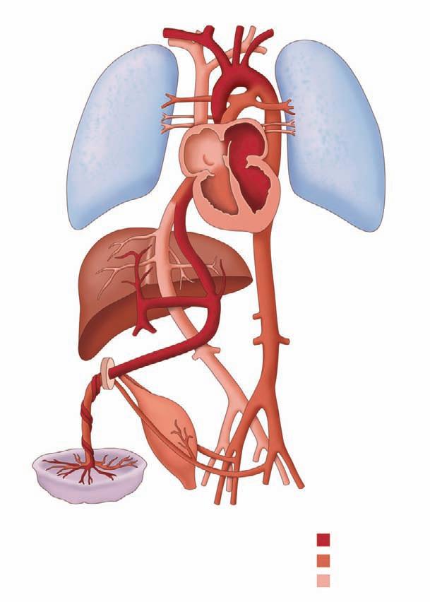 as the two umbilical arteries that return blood to the placental circulation. Thus, the fetal circulation is essentially a parallel circulation with three circulatory “shunts”: the DV, the FO, and the DA. This circulatory design has a targeted goal—the brain, coronary circulation, and upper body are essentially supplied with relatively oxygenated blood via the LV, whereas the lower body receives mainly deoxygenated blood via the RV.
