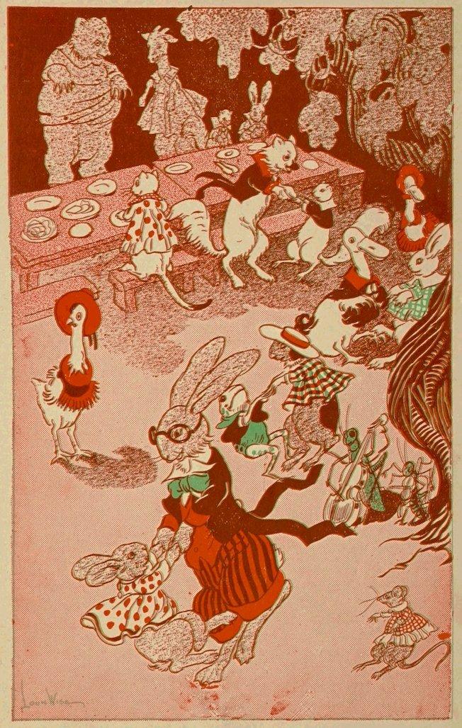 The little party tables were set out under the grape vine, in the shade. Pretty soon along came Sammie and Susie Littletail, the rabbits; Johnnie and Billie Bushytail, the squirrels; Lulu, Alice and Jimmie Wibblewobble, the ducks, and many others.