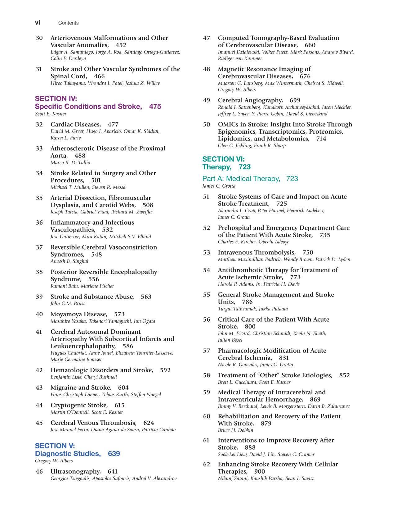 While I have focused my editorial spotlight on a few of the major unresolved topics that are receiving substantial and welldeserved increased attention, I want to emphasize that each and every chapter has been updated with new information. There is a new chapter on posterior reversible encephalopathy, which replaces the old chapter on hypertensive encephalopathy with new authors (Drs. Balu and Fischer); the imaging chapters on CT and MRI have been updated, with expanded discussion of the important role of imaging in patient selection for acute therapy; the chapters on cardiac disease, cryptogenic stroke, and secondary prevention provide more information on atrial fibrillation detection, other possible causes of embolicappearing stroke without known source, and their long term management; the antiplatelet therapy chapter includes updated data from recent trials of dual antiplatelet therapy; and the design of stroke clinical trials chapter has been rewritten by new authors (Drs. Perez, Elm, and Saver) and includes emerging novel approaches to figuring out if new treatments work.
