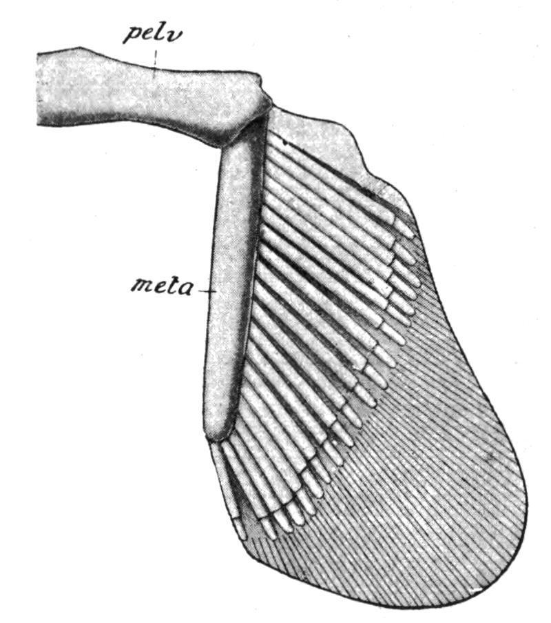 The Pelvic Fins.—In the simplicity of their endoskeletal supports the pelvic fins of Cladoselacheare the most primitive type of paired fins at present known (Fig. 145, B). In general structure they resemble the pectorals, but the radialia are fewer in number, less modified by concentration, and exhibit little, if any, trace of basal fusion. Add to such features as these the apparent absence of any trace of pelvic rudiments, or of basipterygia, and it will be obvious that the pelvic fins differ but little from the median fins of the same Fish except that they are paired. In Pleuracanthus the pelvic fins differ from the corresponding pectorals in being uniserial instead of biserial (Fig. 250). All other Elasmobranchs, including the Holocephali, have uniserial fins, which consist of a large metapterygium, supporting a preaxial fringe of segmented radialia. A propterygium is sometimes present, notably in some of the Skates and Rays, and, like the metapterygium, it is directly connected with the pelvic girdle.