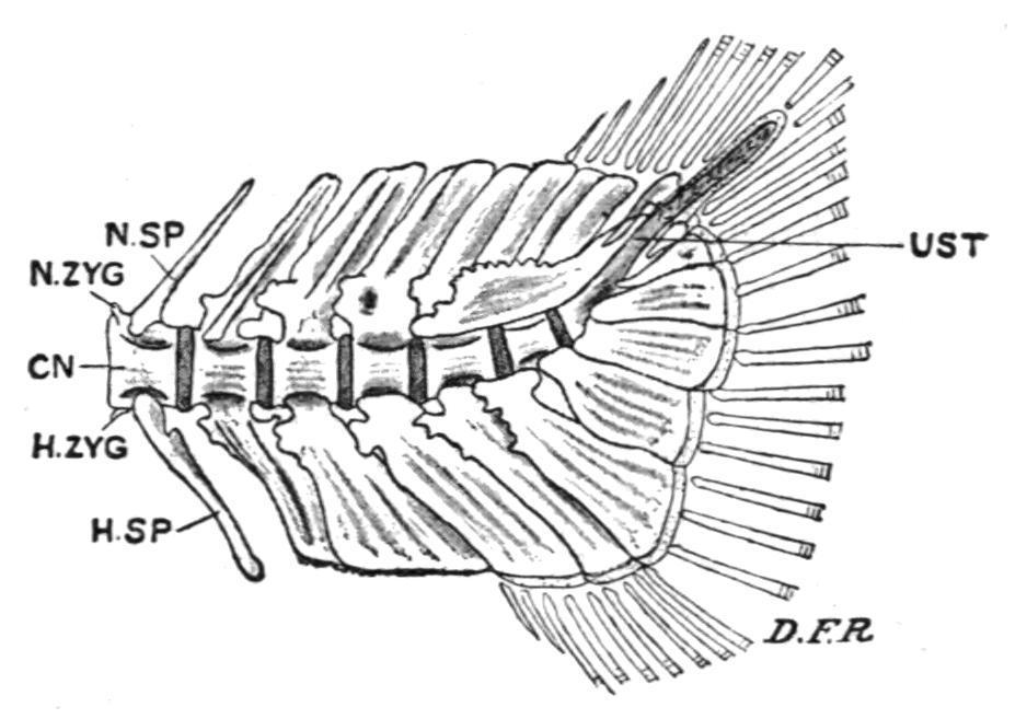 CN, Centrum; D.F.R, dermal fin-rays; H.SP, haemal spine; H.ZYG, haemal zygapophysis; N.SP, neural spine; N.ZYG, neural zygapophysis; UST, the up-tilted, partly ossified, and unsegmented terminal portion of the notochord, or urostyle.
