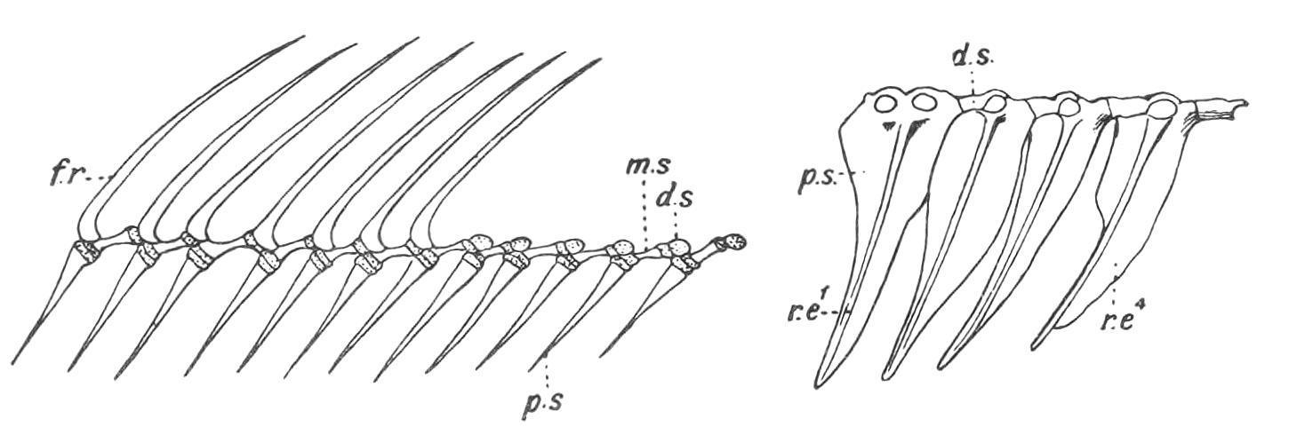The Median Fins.—Whether existing in the form of a continuous fin, or as discontinuous isolated fins, the median fins are provided with skeletal supports, and also with muscles, primitively formed from intrusive clusters of cells derived from a variable number of the neighbouring myotomes, for their varied movements. The skeletal structures of the dorsal and anal fins consist of a series of bony or cartilaginous, rod-like, and typically tri-segmented radial elements or pterygiophores,[209] supporting distally a series of dermal structures in the shape of numerous slender horny fibres or ceratotrichia, as in the Elasmobranchii and Holocephali, or a smaller number of bony dermal fin-rays, which are probably modified scales or lepidotrichia, [210] as in the Teleostomi. The typical tri-segmented character of the radialia is often retained in many existing Elasmobranchs (Fig. 135) and in Pleuracanthus, in Neoceratodus amongst the Dipnoi, in the Chondrostei, in existing Holostei (Fig. 136), and to a greater or less extent in several families of Teleosts (e.g. Salmonidae, Esocidae, Cyprinidae, and some Acanthopterygii); but in the latter group the radialia are greatly prone to reduction, and hence they are more