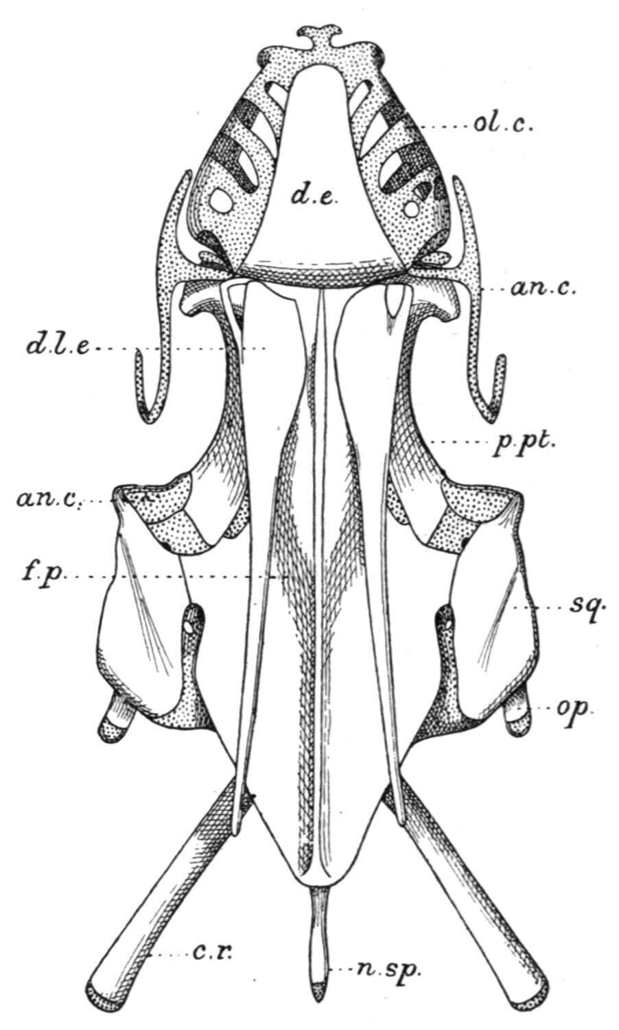 FIG. 134. Dorsal view of the skull of Lepidosiren. an.c, Condyle on the quadrate cartilage for the lower jaw; n.sp, neural spine; op, operculum. For other reference letters see Fig. 133. (From Bridge.)