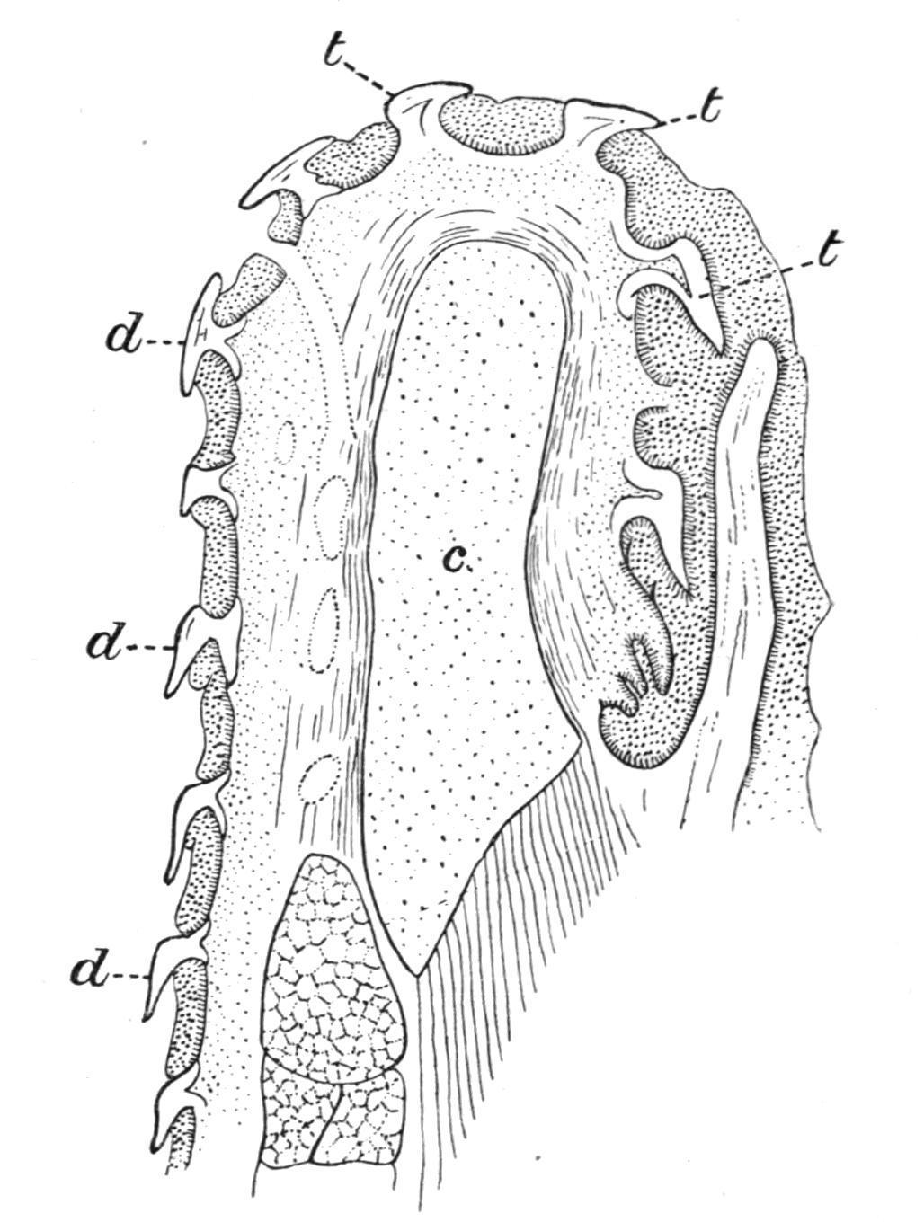 d) on the outer surface of the jaw to teeth (t, t, t) on the oral surface. c, Cartilage of the lower jaw. (From Gegenbaur.)