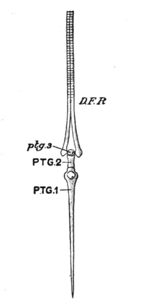 FIG. 139.—A dermal fin-ray and its supporting radial or pterygiophore in the Trout (Salmo fario). D.F.R, Dermal fin-ray; PTG.1, PTG.2, ptg.3, the proximal, middle, and distal segments of which the trisegmented radial consists; ptg.3 is cartilaginous; the other two are bony. (From Parker and Haswell.)