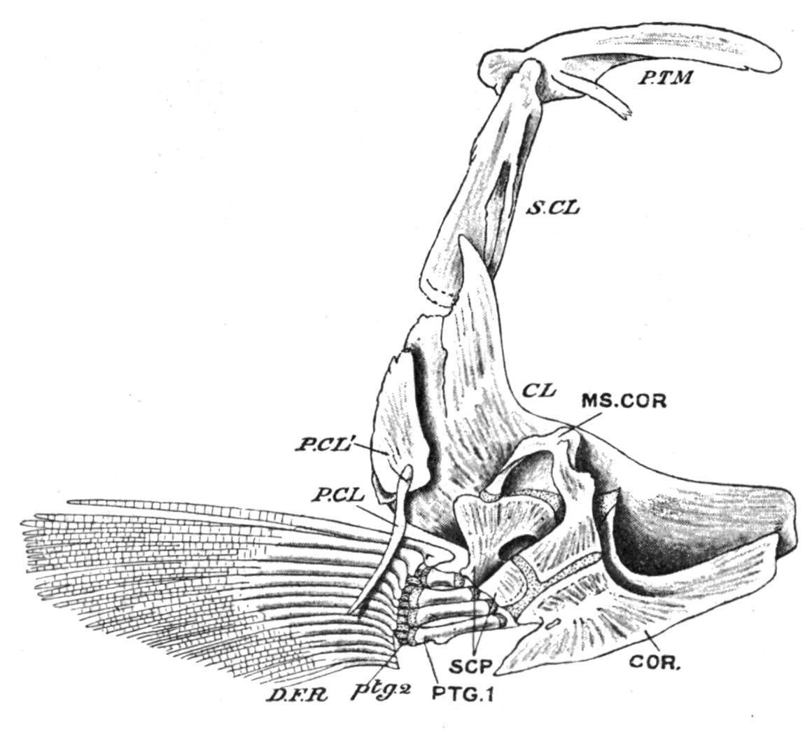 are always present, and to these may be added in the Crossopterygii and Chondrostei an infraclavicle or clavicle proper, while one or two "post-clavicles" may be present in relation with the hinder margin of the cleithrum. The infraclavicles, or in their absence the cleithra (e.g. Holostei and most Teleostei), usually meet in a median ventral symphysis, so that the secondary girdle tends to acquire the characteristic hoop-like arrangement of its parts which has been lost in the primary girdle. With the development of a bony secondary girdle, the primary girdle (scapula and coracoid) becomes much reduced, and, as a rule, does little more than connect the fins with the cleithra. The secondary girdle acquires a dorsal connexion with the skull on each side by means of the post-temporal bone, which is attached below to the supra-clavicle and above to the periotic capsule. In the Chondrostei and the Dipnoi the primary girdle retains its primitive cartilaginous condition, but in the Crossopterygii, Holostei, and in all Teleosts it is ossified as distinct scapulae and coracoids. To these may be added in some Teleosts a mesocoracoid formed by a separate ossification of the coracoid cartilage (Fig. 143). [216]