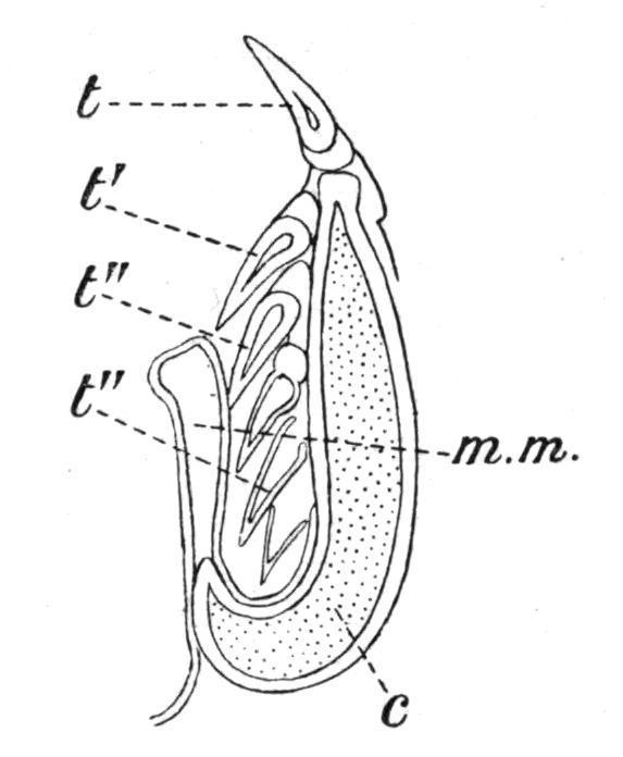 FIG. 152. Transverse section through the jaw of a Shark (Carcharias), showing how the teeth are replaced. c, Cartilage of the jaw; t, functional tooth; t′, its immediate successor; t", t", still younger teeth, covered by the fold of mucous membrane, m. m. (From Ridewood.)