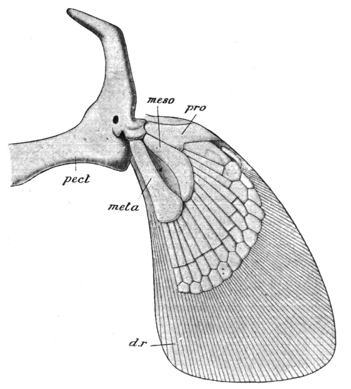 FIG. 141. The right half of the pectoral girdle and the fin of an Elasmobranch (Chiloscyllium). d.r, Dermal horny fibres; meso, mesopterygium; meta, metapterygium; pect, pectoral girdle; pro, propterygium. (From Parker and Haswell.)