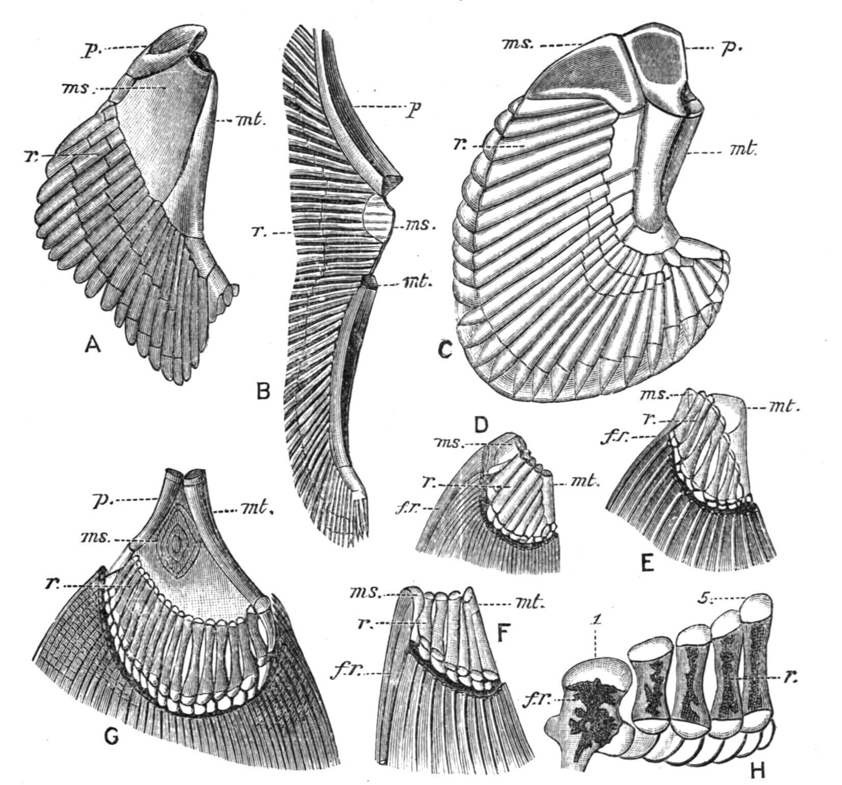 FIG. 146. Pectoral fins of various Fishes. A, Acanthias vulgaris; B, Raia sp.; C, Chimaera monstrosa; D, Acipenser rhynchaeus; E, Amia calva; F, Lepidosteus platyrhynchus; G, Polypterus bichir; H, Salmo salvelinus. The preaxial side of each fin is to the left and the postaxial to the right. f.r, Dermal fin-ray; ms, mesopterygium; mt, metapterygium; p, propterygium; r, free radialia; 1, 5, the preaxial and postaxial basal elements in a Teleost, which may be mesopterygial and metapterygial pieces respectively, the three remaining basal pieces probably being intrusive metapterygial radialia directly articulating with the pectoral girdle. In B, D, E, and F, similar intrusive radialia are shown. (From Gegenbaur.)