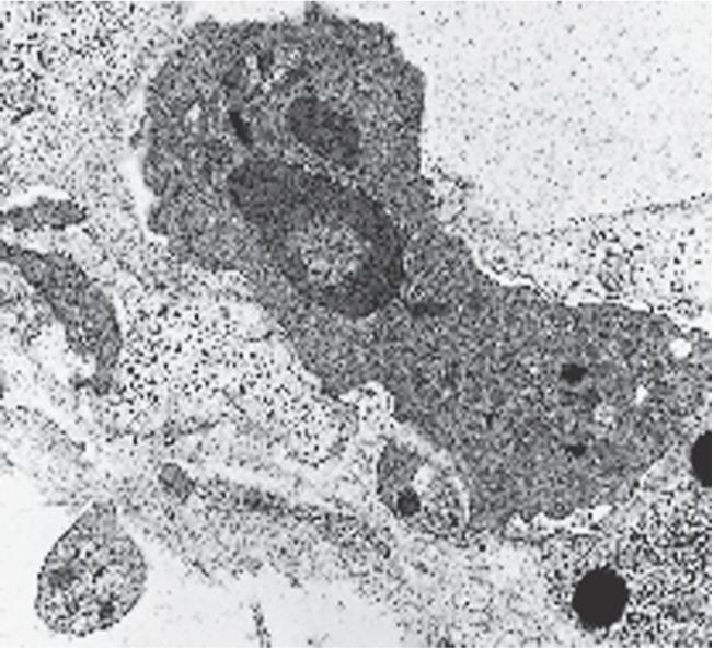 Fig. 1.8 Three phases in neutrophil migration across endothelium A neutrophil adheres to the endothelium in a venule (1) It extends its pseudopodium between the endothelial cells and migrates towards the basement membrane (2) After the neutrophil has crossed into the tissue, the endothelium reseals behind (3) The entire process is referred to as diapedesis. (Courtesy Dr I Jovis.)