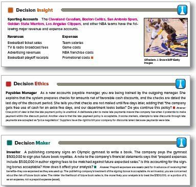 Whether we prepare, analyze, or apply accounting information, one skill remains essential: decision making. To help develop good decision-making habits and to illustrate the relevance of accounting, we use a learning framework to enhance decision making in four ways. (See the four nearby examples for the different types of decision boxes, including those that relate to fraud.) Decision Insight provides context for business decisions. Decision Ethics and Decision Maker are role-playing scenarios that show the relevance of accounting. Decision Analysis provides key tools to help assess company performance.