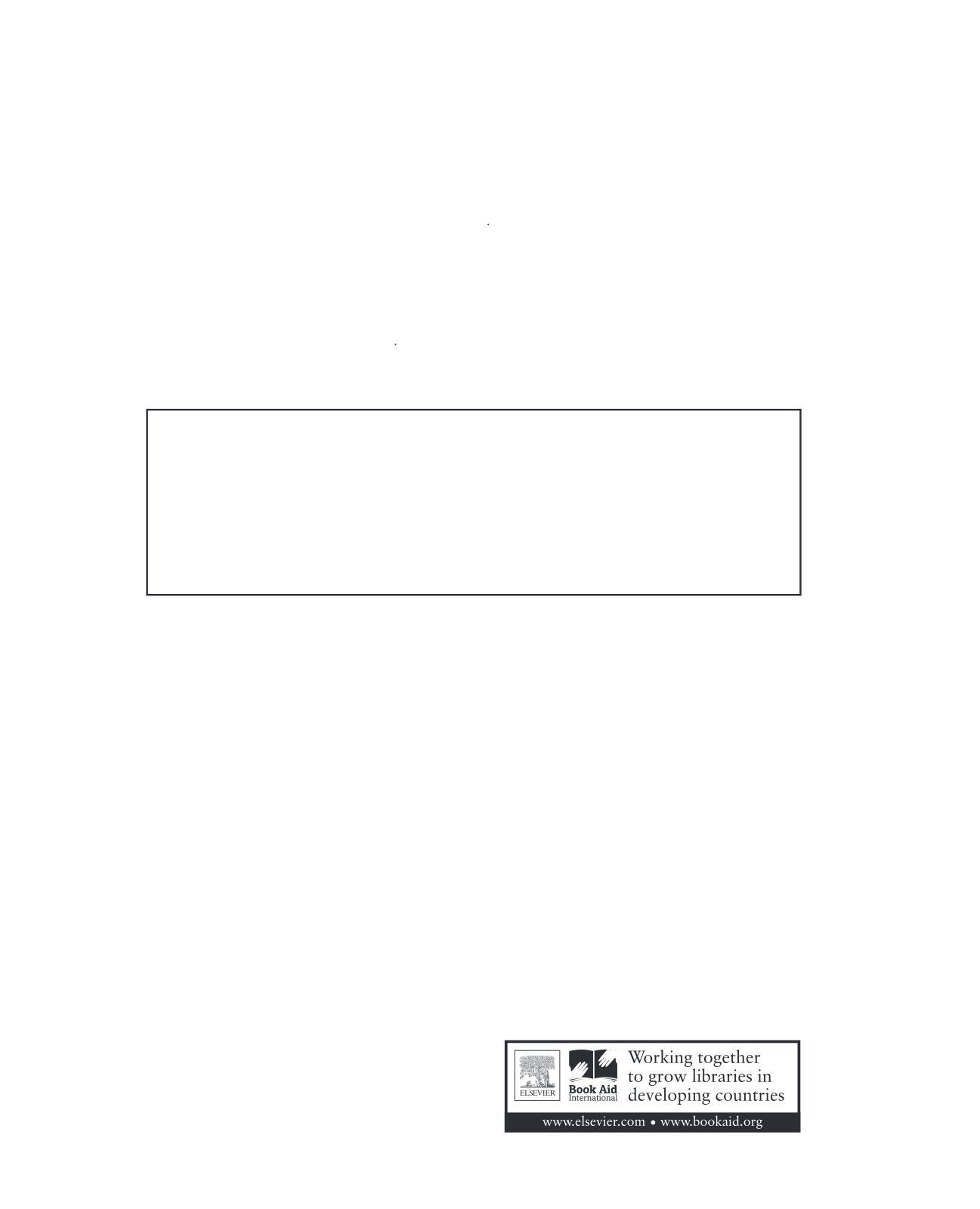 No part of this publication may be reproduced or transmitted in any form or by any means,electronic or mechanical,including photocopying,recording,or any information storage and retrieval system, without permission in writing from the publisher Details on how to seek permission,further information about the Publisher’s permissions policies and our arrangements with organizations such as the Copyright Clearance Center and the Copyright LicensingAgency,can be found at our website:www.elsevier.com/permissions