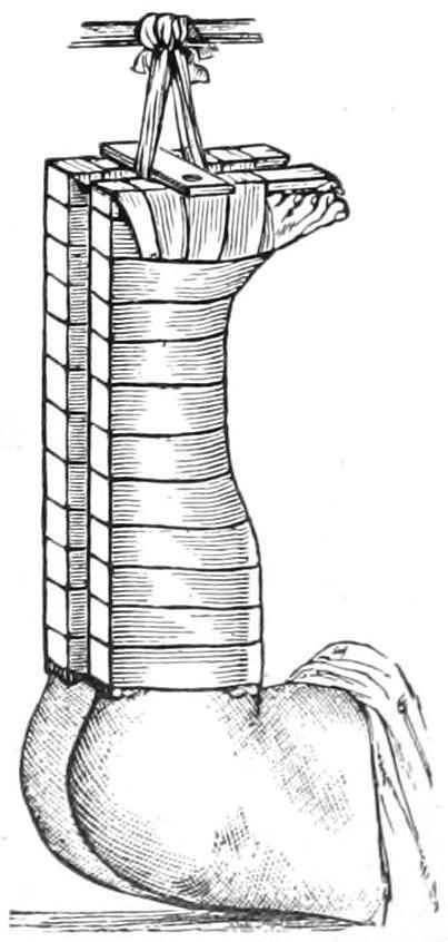 [41] Before applying the strips of adhesive, the best for the purpose being that made of moleskin spread with material with which zinc oxide is incorporated, the limb should be carefully washed and shaved and then completely dried. A little cotton should be placed over each malleolus, in order to avoid pressure-sores, while the strip of wood beneath the foot should be sufficiently wide to prevent or minimize this pressure. The heel should be kept off the mattress.