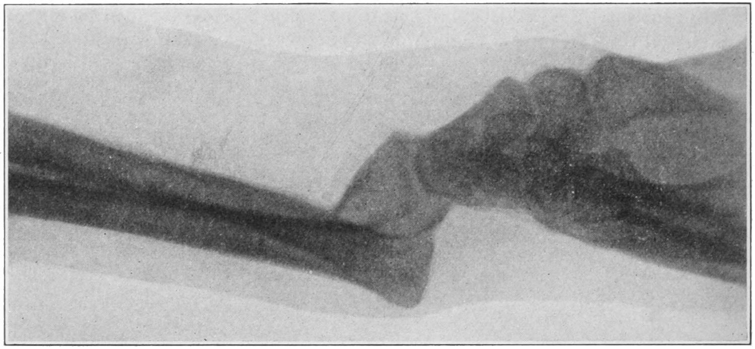 Fractures of the carpal bones seldom occur, except when the parts have been crushed. The scaphoid is, however, broken much more often, and doubtless many cases of so-called severe sprain include this injury. The use of the x-rays has done more to teach the relative frequency of carpal fractures than was ever previously appreciated. The scaphoid ossifies by two centres, which do not appear until the eighth year. When the bone has been thus cracked the usual signs of sprain are present, which subside and leave a tender wrist and hand whose fingers can be normally moved, but whose wrist movements are reduced one-half, while attempts at motion beyond these limits produce great muscle spasm and pain. Codman and Chase[40] have shown that the sheaths of the radial extensor tendons are in close relation to the periosteum of the bone at this point, as well as to that of the radius, so that by injury here blood may escape into the sheath without appearing at other parts; the result being a tense, fluctuating, triangular swelling over the radial half of the wrist, the blood being effused so deeply as not to discolor, or at least not at first. They regard the presence of such an engorged bursa as diagnostic of fracture either of the radius or the scaphoid.