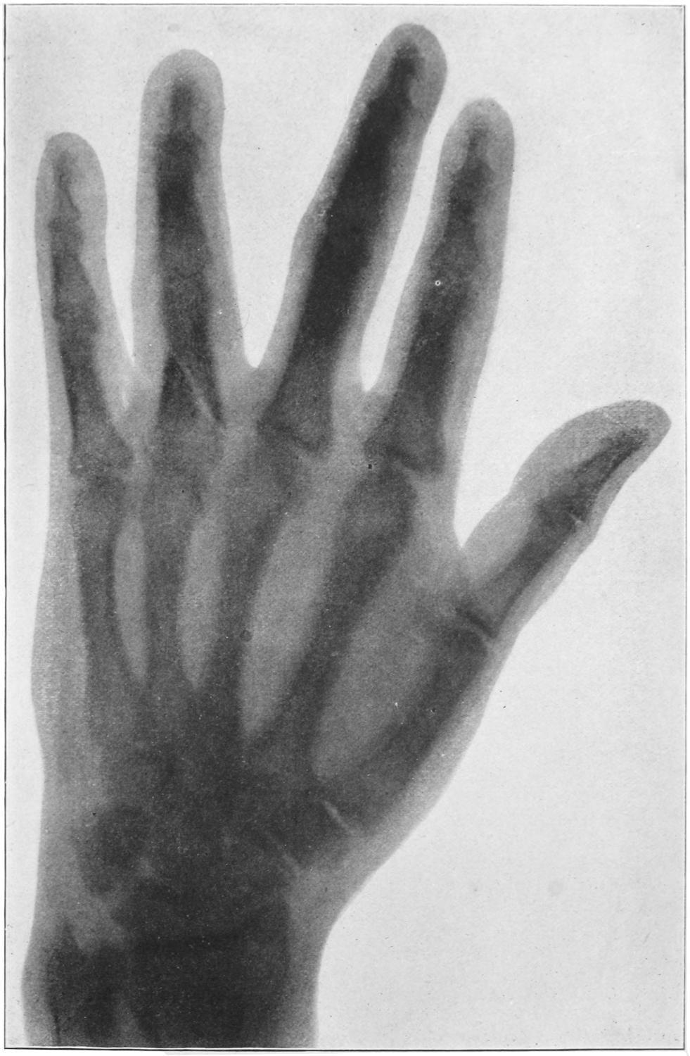 The metacarpalbones are frequently broken, usually as the result of violence, the distal portions suffering more than the proximal. The diagnosis is best made with the fingers closed, when any lack of symmetry in the row of knuckles may be seen or any protrusion of a fragment noted. Here the x-rays are useful. Such injury should be treated by placing the hand upon a palmar splint extending well up the forearm and maintaining rest by suitable pressure, with or without traction upon the finger of the bone involved. For this purpose adhesive plaster may be passed up and down the finger and attached to an elastic band which is fixed to the end of the splint.