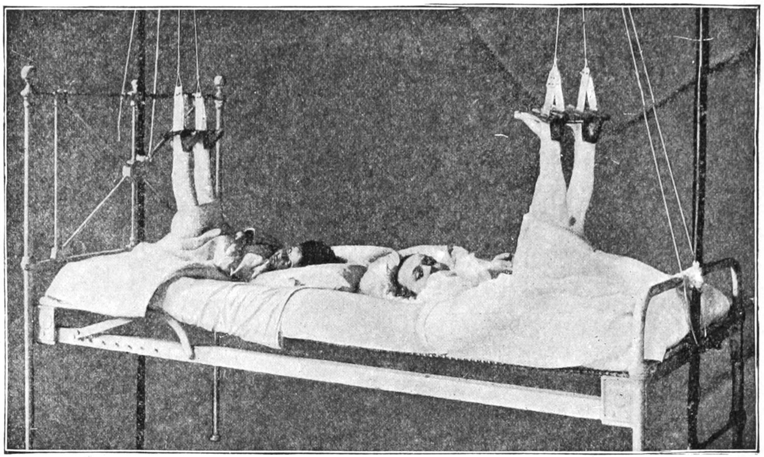 This method has found favor in the West under the enduring influence of Hodgen’s teaching. In the East it is not so generally practised. It has, however, several advantages, as follows: (1) Equably perfect and comfortable extension; (2) easy adjustment; (3) easy exposure for inspection; (4) when a fracture is compound it permits of easy application of dressings; (5) adaptability to nearly all fractures of the femur. It is peculiarly serviceable for feeble and aged patients who chafe at restraint. If it be desirable to flex the knee to a considerable degree this can be done, e.g., in fractures near the lesser trochanter.