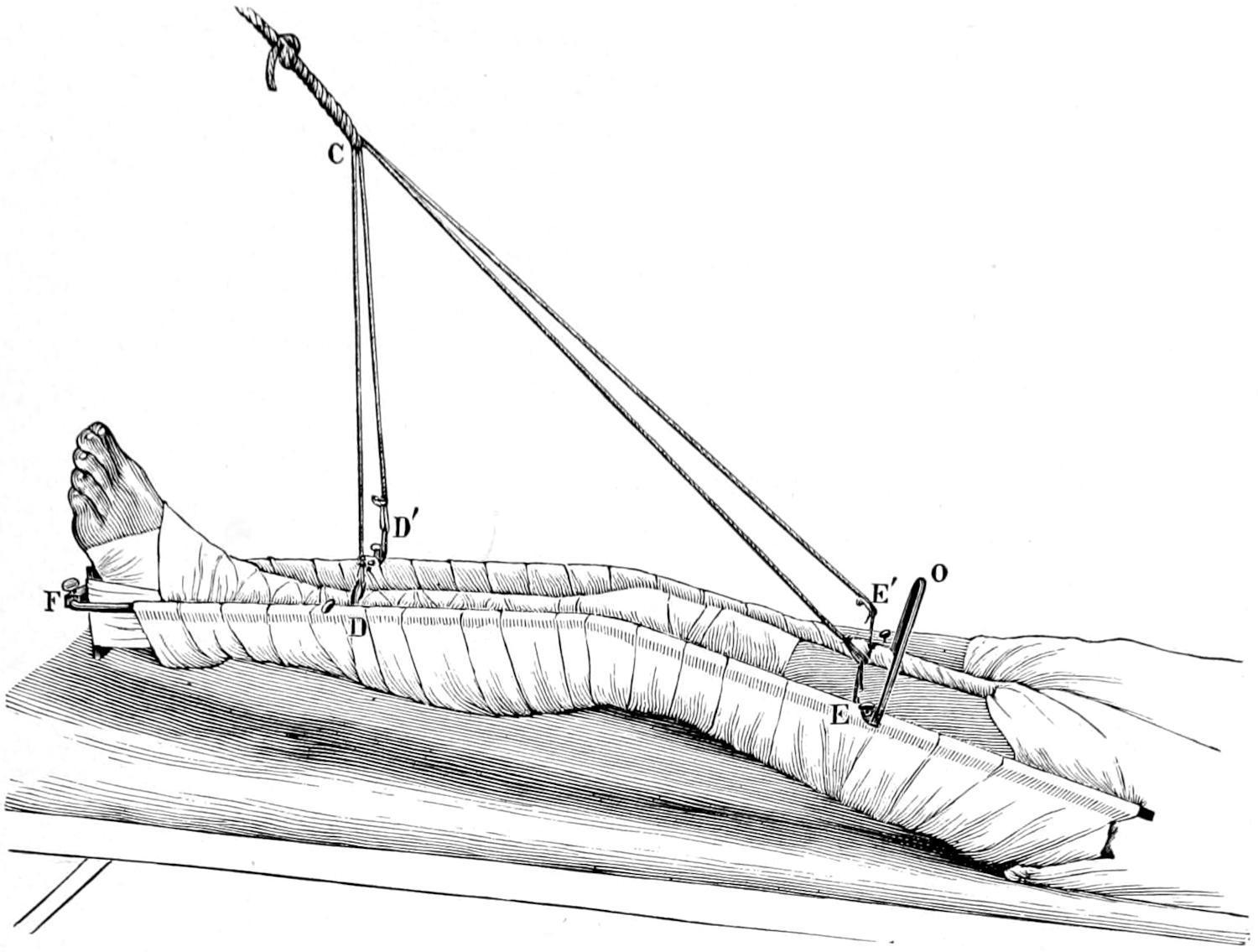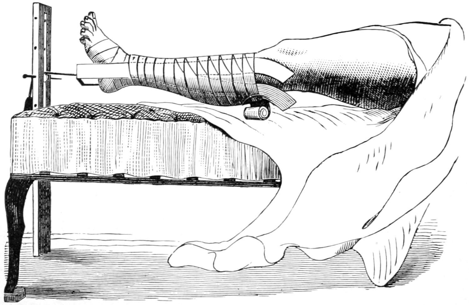 In this method of treatment there is no violent attempt made at reduction or overcoming displacement, but dependence is placed, at least for two or three days, on the effect of the constant pull and its overcoming muscular activity. After this such added splints or expedients may be adopted as the case may require. The knee is usually flexed at a comfortable angle, the intent being not to lift the foot too high, so as to avoid being compelled to overcome this added weight, but to regulate the tension by the obliquity of the suspending cord.