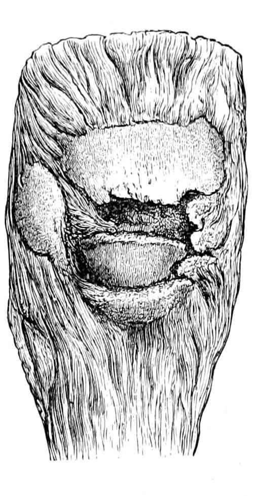 During the active period of middle life the patella is the bone most frequently broken by muscular violence. In many cases it is practically cracked over the condyles, as one would crack a piece of wood over the knee. If direct force be applied, as by a fall, in connection with the above, the effect is even more marked. In such cases the fracture is sometimes comminuted (Fig. 325), or the line of fracture may run more or less perpendicularly rather than horizontally. Ordinarily, however, these fractures are transverse, while the upper fragment is pulled upward, sometimes to a considerable distance, by the powerful extensors of the leg. When the fracture runs vertically the displacement is very slight. Occasionally these fractures are compound, a most undesirable complication, since the knee-joint is thus exposed to infection, from which it suffers unless first attention be prompt and scientific. There
