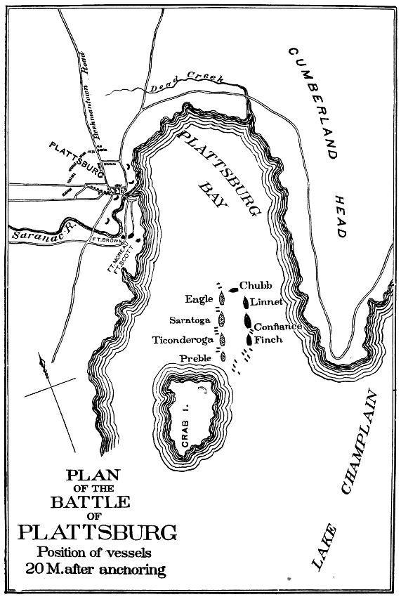 Macdonough anchored his four large vessels across Plattsburg Bay, where it was a mile and a half wide, and placed his gunboats in their rear to fill the gaps. Cumberland Head on his left and front, and Crab Island on his right obliged the enemy to enter in a line so narrow that Downie would find no room to anchor on his broadside out of carronade range, but must sail into the harbor under the raking fire of the American long guns, and take a position within range of the American carronades.[173] As the battle was to be fought at anchor, both squadrons would as a matter of course be anchored with springs on their cables; but Macdonough took the additional precaution of laying a kedge off each bow of the “Saratoga,” bringing their hawsers in on the two quarters, and letting them hang in bights under water.[174] This arrangement enabled him to wind his ship at any time without fear of having his cables cut by the enemy’s shot, and to use his larboard broadside if his starboard guns should be disabled. In effect, it doubled his fighting capacity.