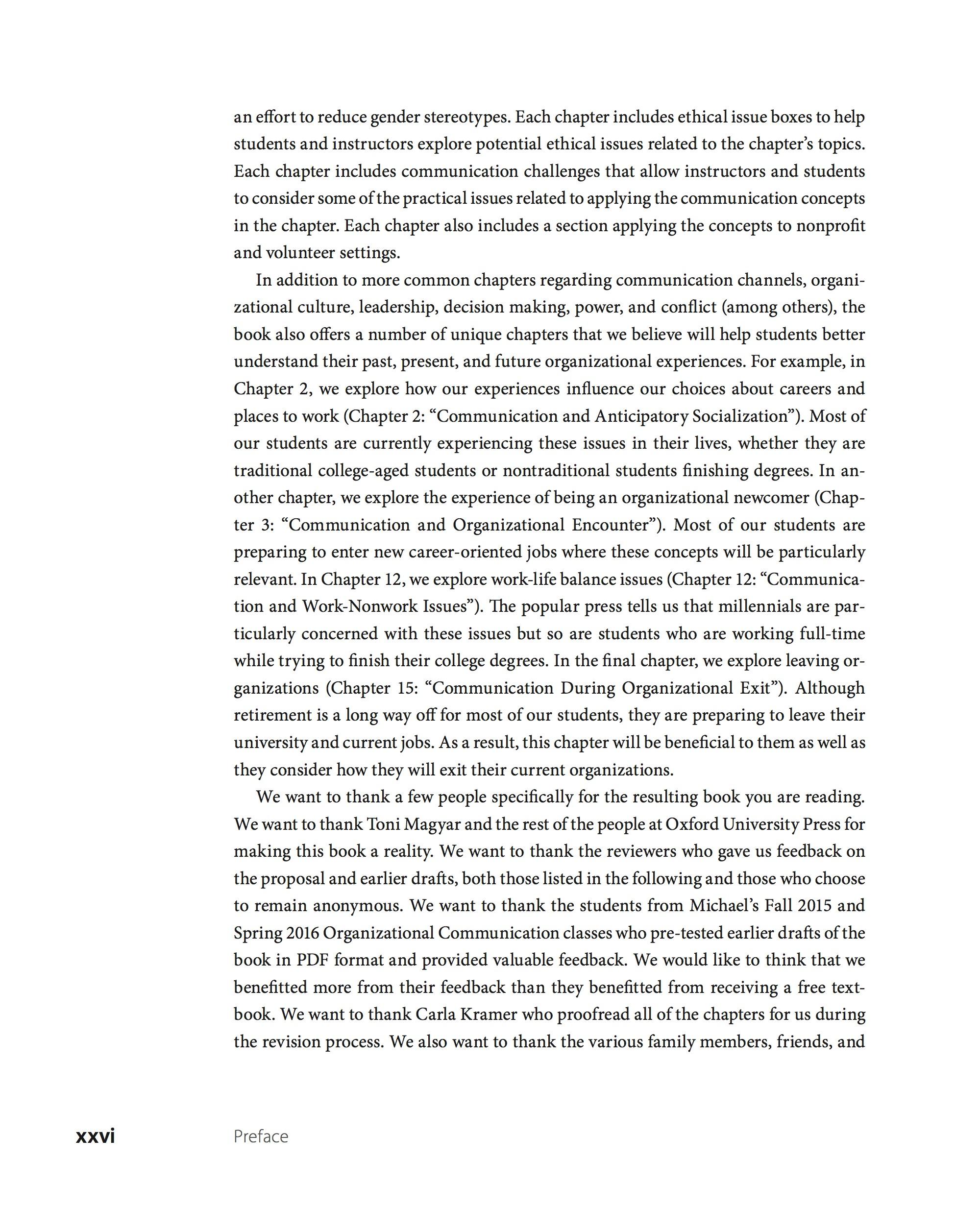 We want to thank a few people specifically for the resulting book you are reading. We want to thank Toni Magyar and the rest of the people at Oxford University Press for making this book a reality. We want to thank the reviewers who gave us feedback on the proposal and earlier drafts, both those listed in the following and those who choose to remain anonymous. We want to thank the students from Michael's Fall 2015 and Spring 2016 Organizational Communication classes who pre-tested earlier drafts of the book in PDF format and provided valuable feedback. We would like to think that we benefitted more from their feedback than they benefitted from receiving a free textbook. We want to thank Carla Kramer who proofread all of the chapters for us during the revision process. We also want to thank the various family members, friends, and