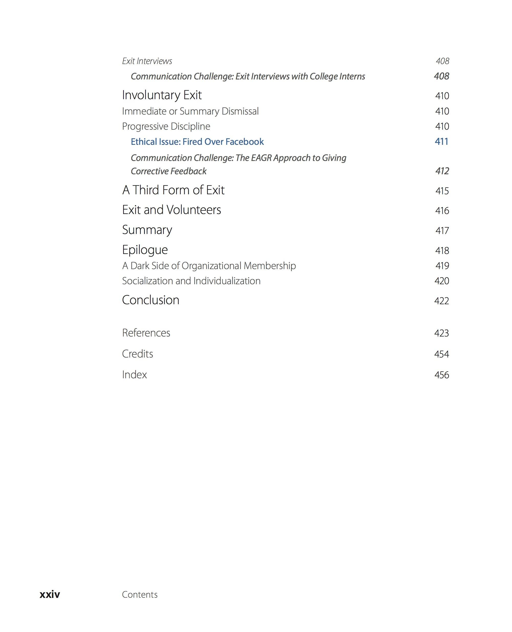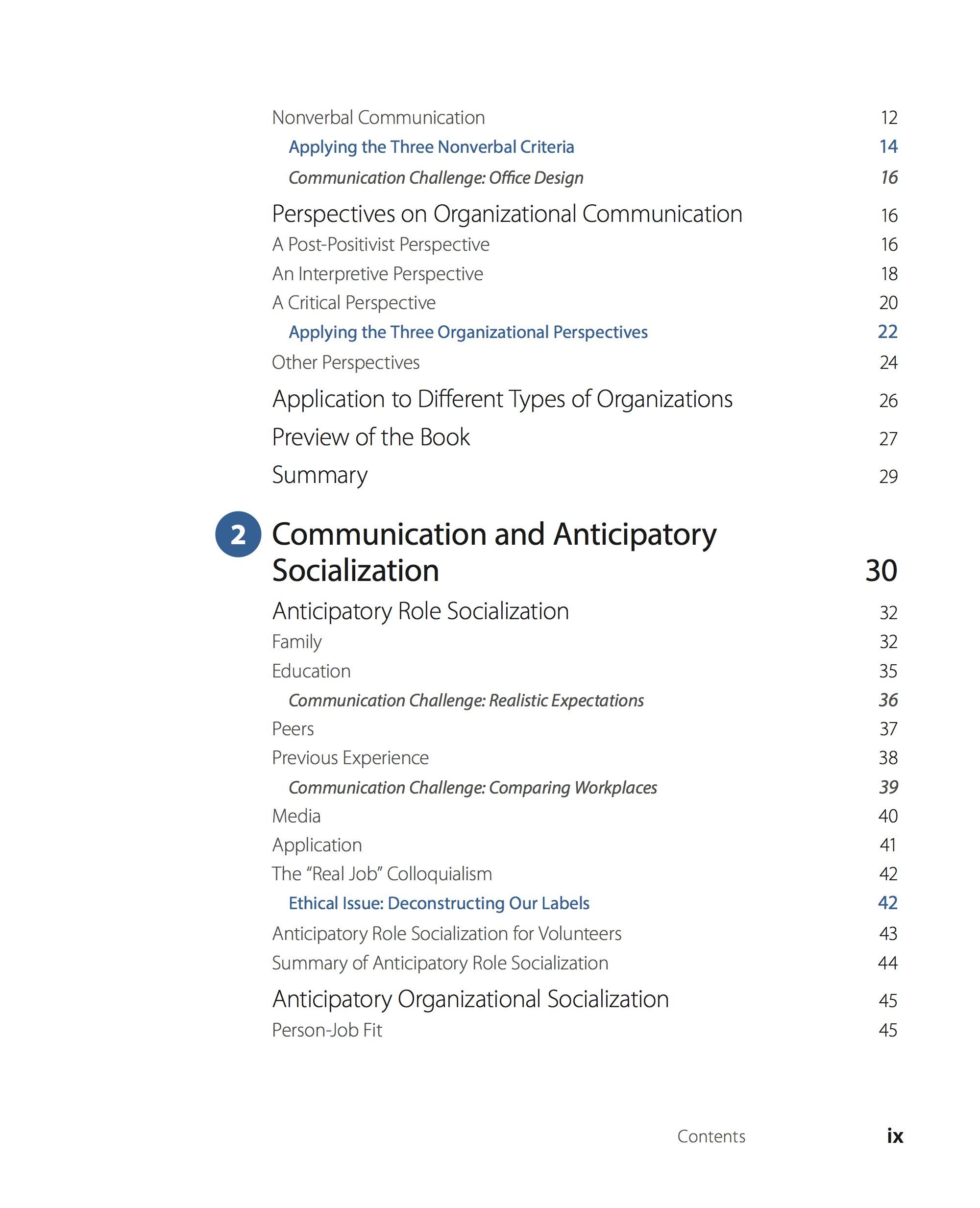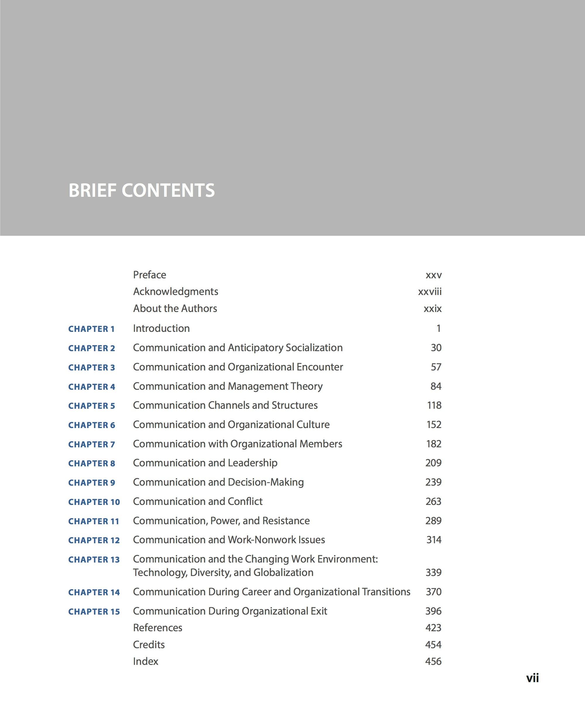 In addition to more common chapters regarding communication channels, organizational culture, leadership, decision making, power, and conflict (among others), the book also offers a number of unique chapters that we believe will help students better understand their past, present, and future organizational experiences. For example, in Chapter 2, we explore how our experiences influence our choices about careers and places to work (Chapter 2: ''Communication and Anticipatory Socialization''). Most of our students are currently experiencing these issues in their lives, whether they are traditional college-aged students or nontraditional students finishing degrees. In another chapter, we explore the experience of being an organizational newcomer (Chapter 3: ''Communication and Organizational Encounter''). Most of our students are preparing to enter new career-oriented jobs where these concepts will be particularly relevant. In Chapter 12, we explore work-life balance issues (Chapter 12: ''Communication and Work-Nonwork Issues''). The popular press tells us that millennials are particularly concerned with these issues but so are students who are working full-time while trying to finish their college degrees. In the final chapter, we explore leaving organizations (Chapter 15: ''Communication During Organizational Exit''). Although retirement is a long way off for most of our students, they are preparing to leave their university and current jobs. As a result, this chapter will be beneficial to them as well as they consider how they will exit their current organizations.